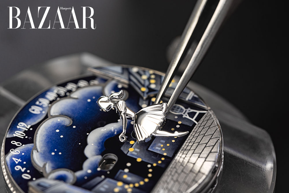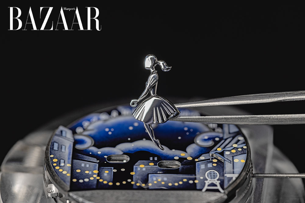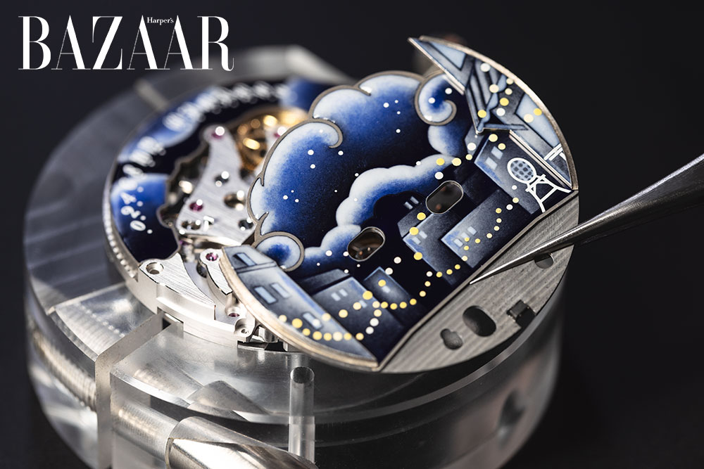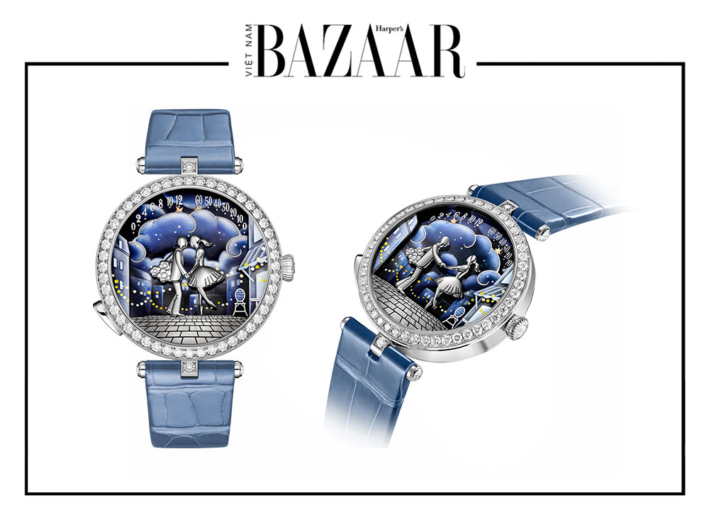 Bên trong mặt đồng hồ, hiệu ứng chiều sâu được nhân lên với năm mặt phẳng khác nhau. Bảng màu sắc của men grisaille và men grisaille màu gợi lên sự tương phản giữa sáng và tối trong một đêm đầy sao. Những chiếc đèn lồng và một lối đi lát đá cuội bằng vàng trắng – được chế tác thủ công bởi các nghệ nhân của Maison – gợi nhớ đến những con phố ở Paris.