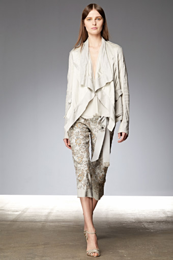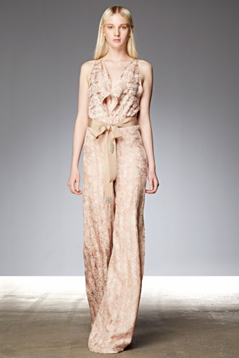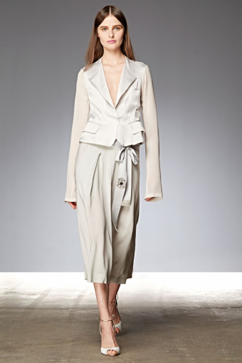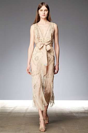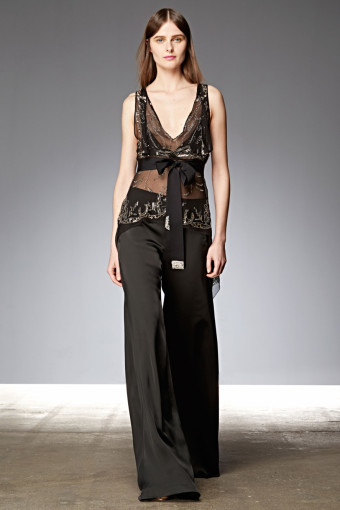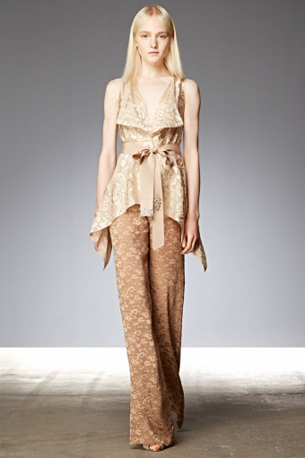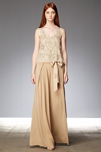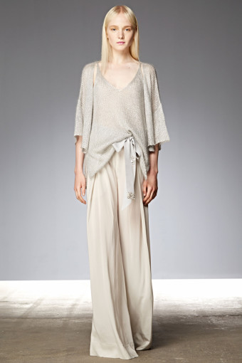Một số thiết kế đáng chú ý có thể kể đến, đó là chiếc đầm quấn bằng chất liệu jersey chốt lại bằng chi tiết trang trí pha lê một bên hông. Đó còn là chiếc áo dệt kim cổ chữ V ánh bạc phủ bên trên quần rộng kiểu pyjamas, hay áo tank top hai tầng kết hạt lấp lánh đi cùng quần ống rộng bằng chất liệu jersey mềm rủ màu vàng cát.