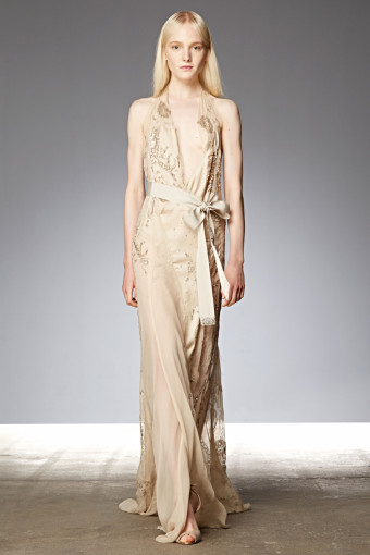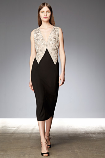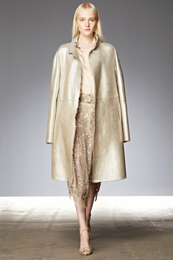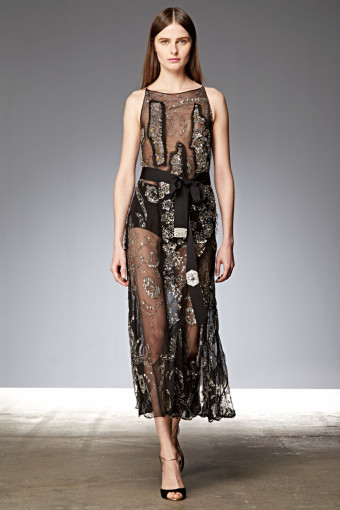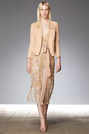 Donna Karan cũng không quên mốt đầm slipdress đã được các sao lăng xê không mệt mỏi trong thời gian qua nhưng bà nâng cấp kiểu đầm này với những hạt sequin đính khắp thân tạo độ lấp lánh. Chỉ cần kết hợp với chiếc áo khoác bằng chất liệu da lộn cùng tông, quý cô đã có ngay một bộ trang phục chỉn chu khi cần.