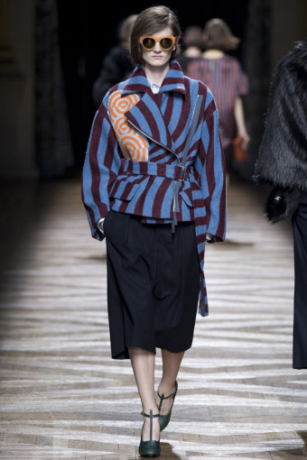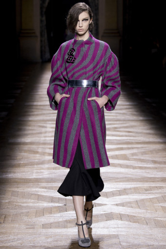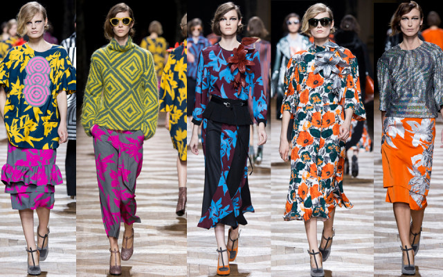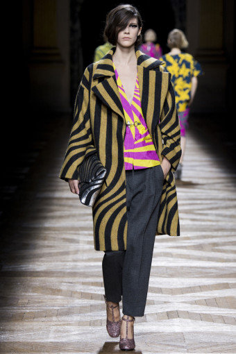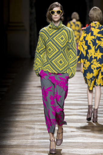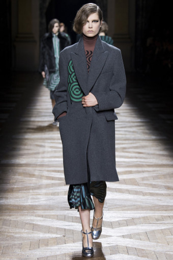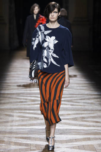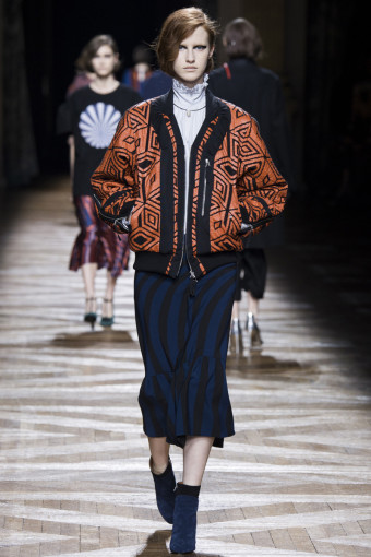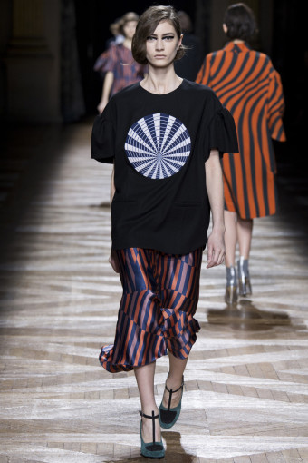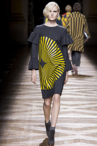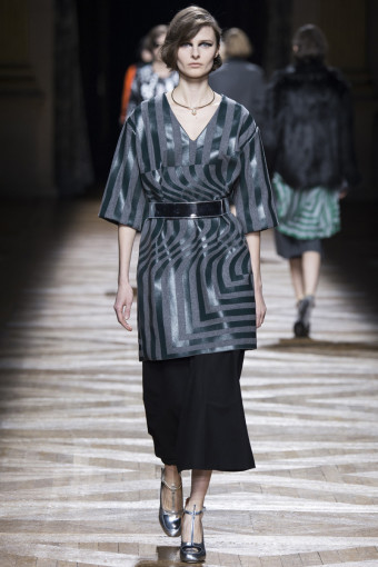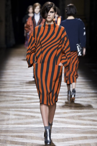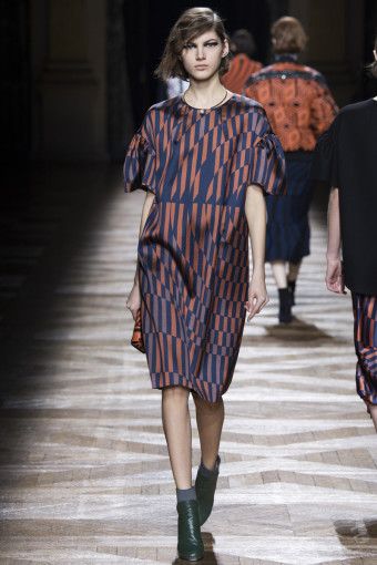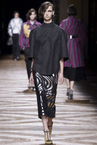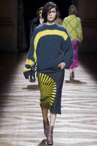 Một trong những cách để phán đoán những gì bạn sẽ thấy trong một bộ sưu tập womenswear là theo dõi các show diễn menswear diễn ra trước đó. Có nhiều nhà thiết kế sẽ đưa ra những dấu hiệu rõ rệt, điển hình như Dries Van Noten. Bộ sưu tập womenswear mùa thu đông năm nay của ông là một sự tiếp diễn của những họa tiết Op Art đầy màu sắc từ bộ sưu tập menswear hồi tháng Giêng. Đó là những họa tiết sọc xoáy tròn, lượn sóng như kính vạn hoa, đan xen trong các gam màu hồng – vàng, xám – xanh lá, xanh navy – cam trải dài từ thân áo đến chân váy.