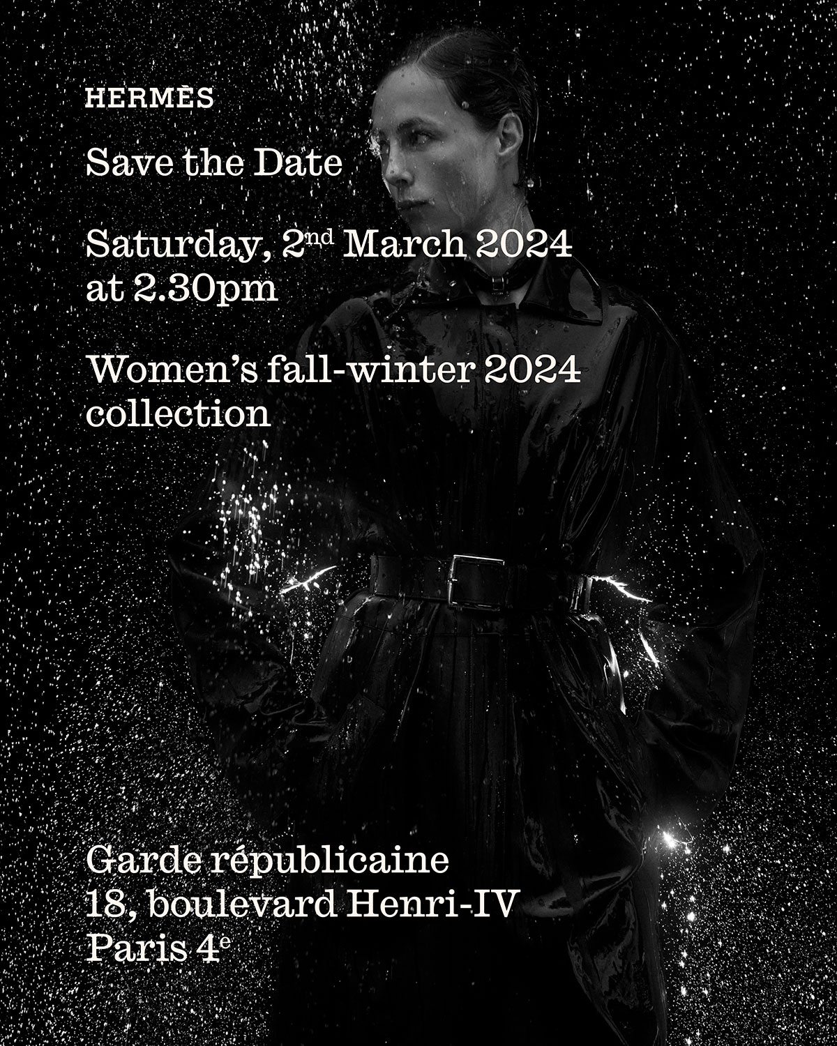 Mùa này, show diễn của Hermès diễn ra ở Salle des Traditions de la Garde Républicaine, bảo tàng ghi lại di sản và truyền thống của Garde Républicaine, đơn vị nghi lễ của Lực lượng Hiến binh Quốc gia Pháp.
