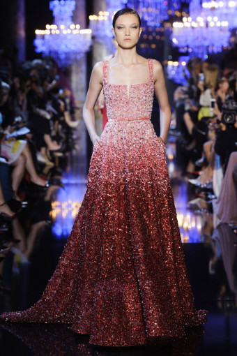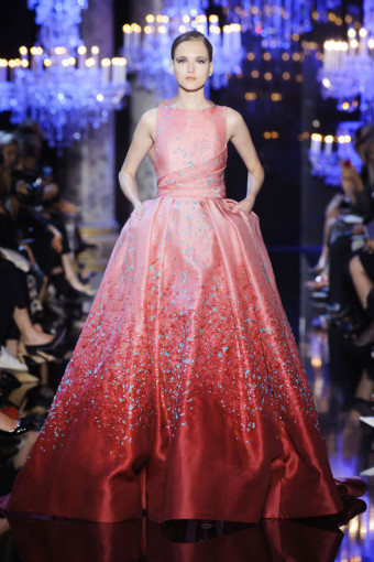 Elie Saab cũng tiếp tục phát huy hiệu ứng chuyển màu ombré trên các thiết kế, vốn rất được yêu thích từ những mùa trước. Cách kết hợp màu tinh tế cũng khiến những bộ đầm nổi bật hơn hẳn, ví như chiếc đầm hồng với chân váy ombré đính sequin màu xanh ngọc lam. Sự kết hợp hồng và xanh này còn được tìm thấy trên hai chiếc đầm hiếm hoi in hoa hồng phủ khắp thân trên của áo. Những thiết kế này hứa hẹn sẽ rất được các ngôi sao ưa chuộng trên thảm đỏ thời gian tới.