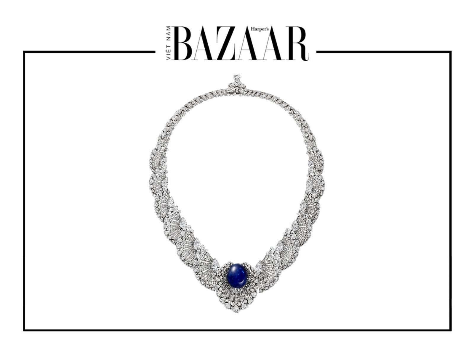 Điểm nhấn thú vị nhất chính là khả năng tháo rời của tuyệt tác này. Trong thiết kế nguyên bản, Pavocelle sở hữu một viên Sapphire Ceylon hình Oval nặng tới 58,08 carat (ảnh trên). Tuy nhiên, Elle Fanning đã đưa ra một lựa chọn đầy cá tính: cô tháo rời viên đá chủ để diện chiếc vòng ở trạng thái “thuần khiết” nhất với kim cương trắng.