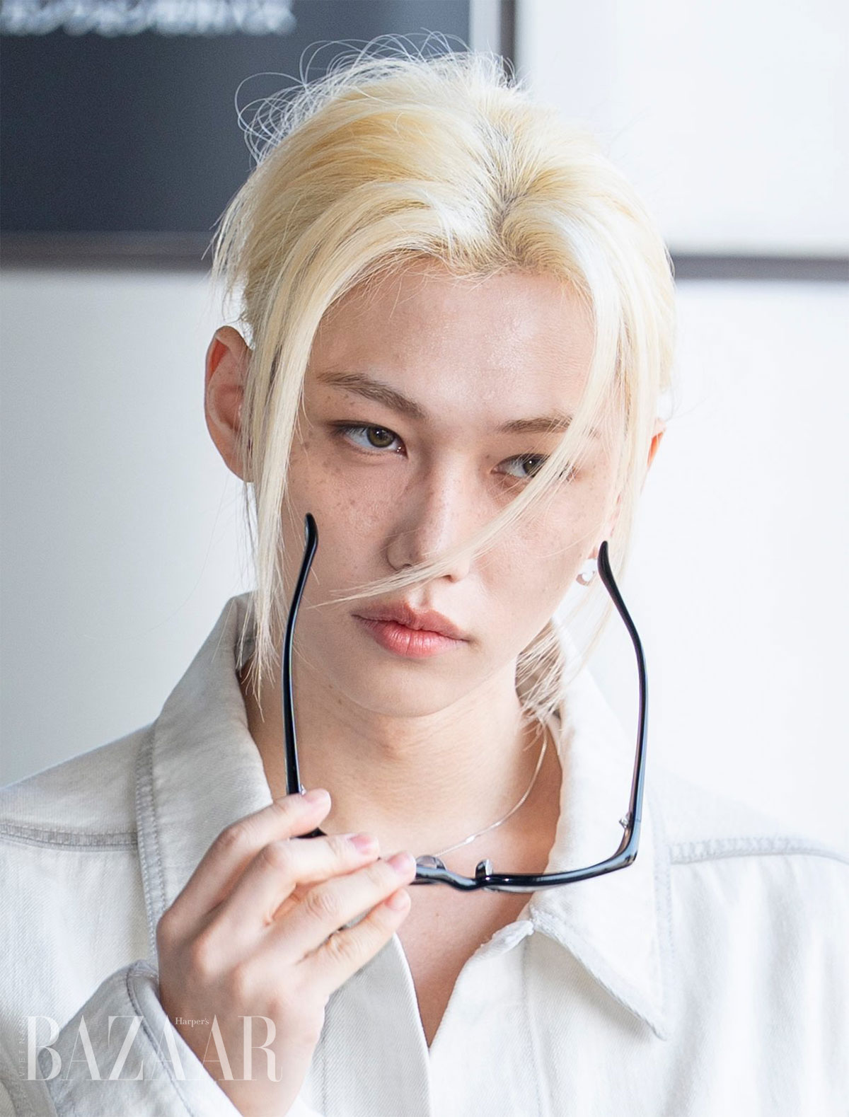 Trong chuyến đi lần này, Felix chọn cho mình một phong cách đơn giản nhưng không hề đơn điệu. Anh xuất hiện với mái tóc màu bạch kim đặc trưng được buộc gọn gàng, diện áo ba lỗ trắng gân nổi phối cùng quần jeans đen dáng loe. Chiếc áo khoác denim trắng với những chi tiết mài rách tạo nên vẻ ngoài bụi bặm nhưng vẫn giữ được tinh thần cao cấp.
