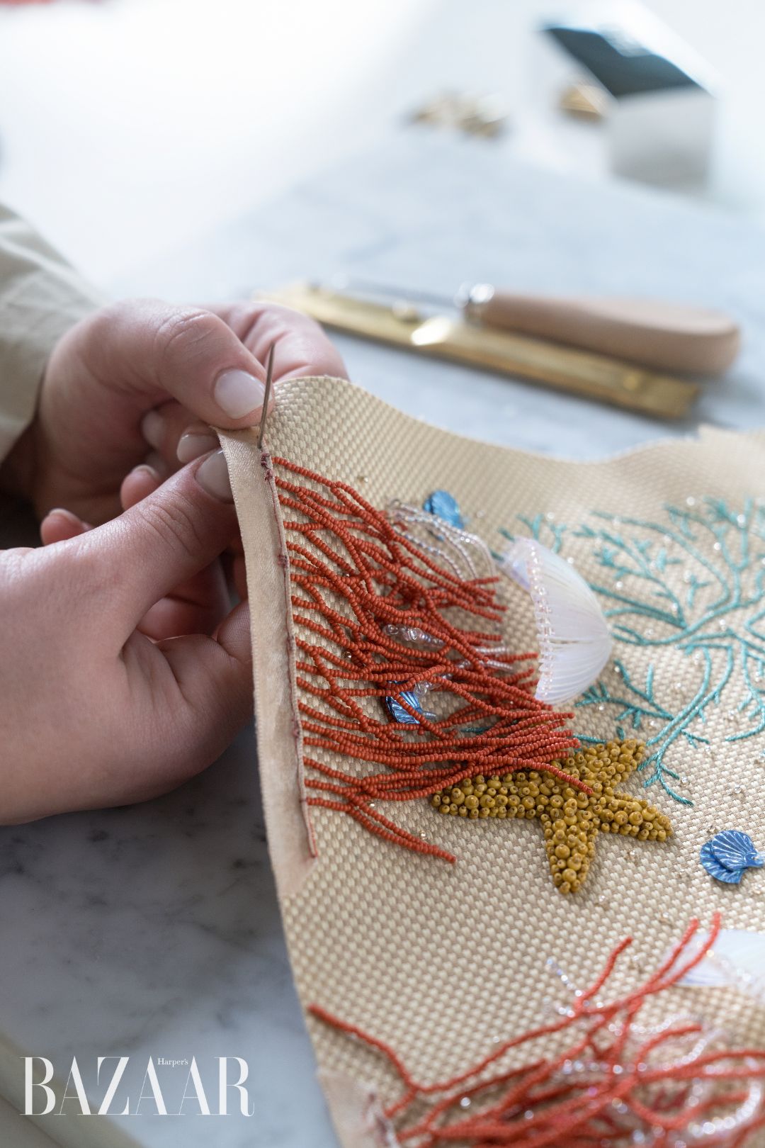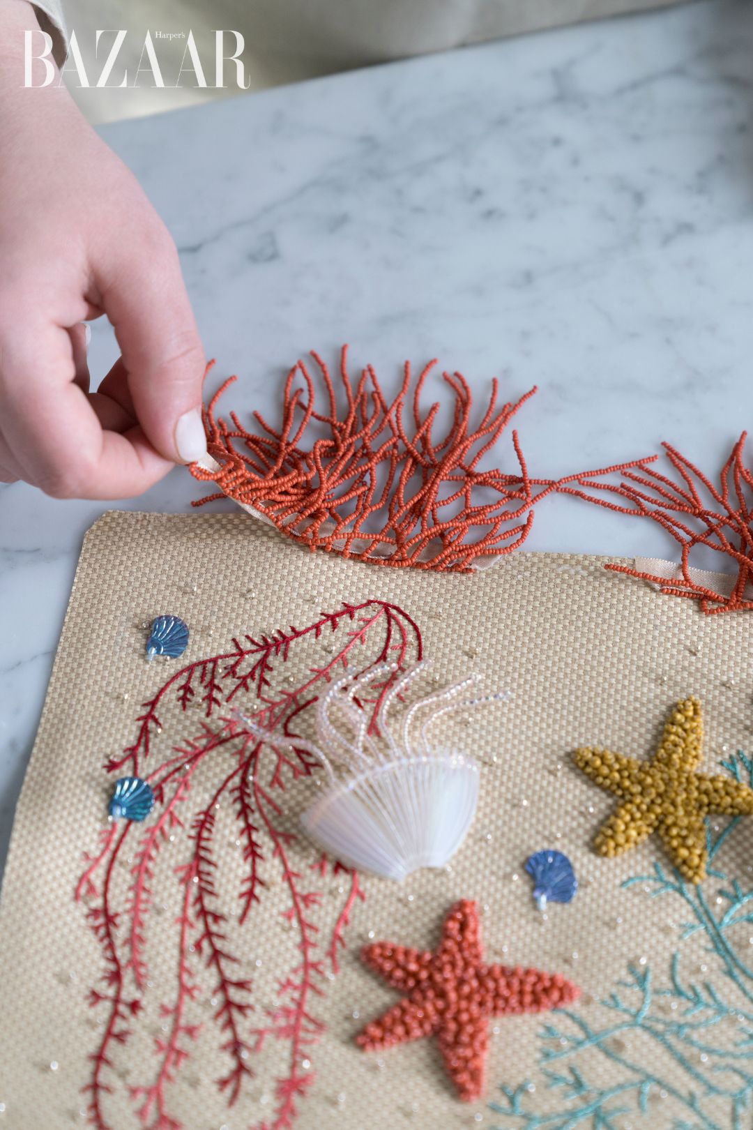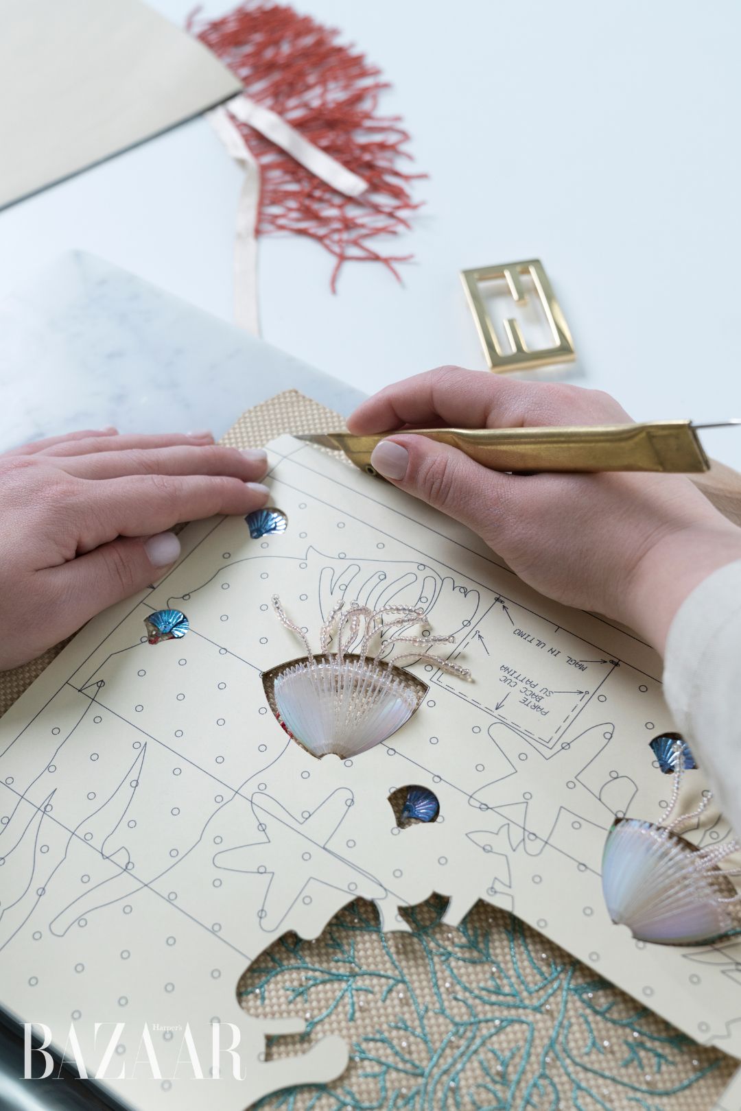 Chi tiết san hô đỏ trên cổ áo. Ảnh: Fendi