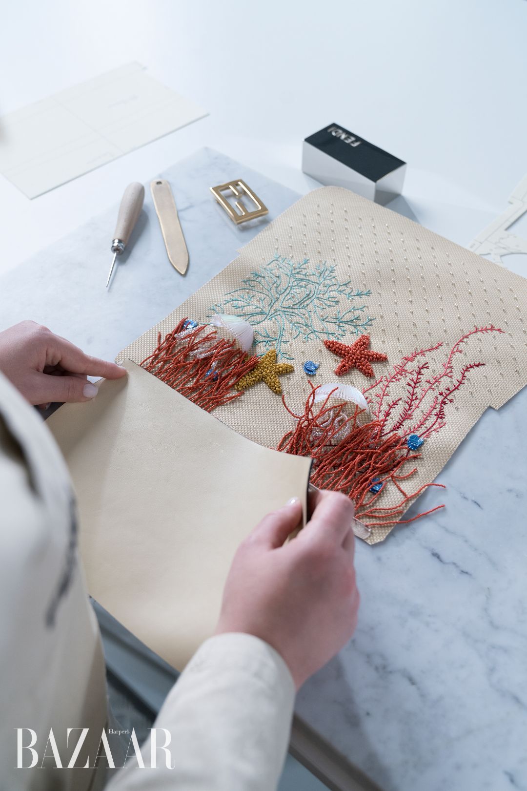 Một chiếc túi xách Baguette với chi tiết san hô thêu tay tinh xảo, minh chứng cho kỹ nghệ trăm năm của Fendi.