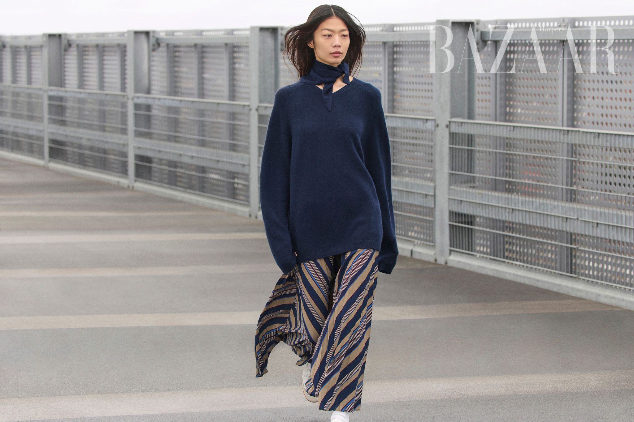 Để tăng phần thanh lịch, bạn có thể layer item này bên trong một chiếc áo khoác vải tweed hoặc áo choàng dạ dáng dài hai hàng khuy, tạo nên tổng thể sang trọng mà vẫn ấm áp cho những ngày se lạnh. Trong khi đó, mẫu áo len cashmere dáng suông cổ chữ V được làm mới đầy thú vị với phụ kiện khăn quàng cùng chất liệu và tông màu (có thể tháo rời khi không cần thiết).