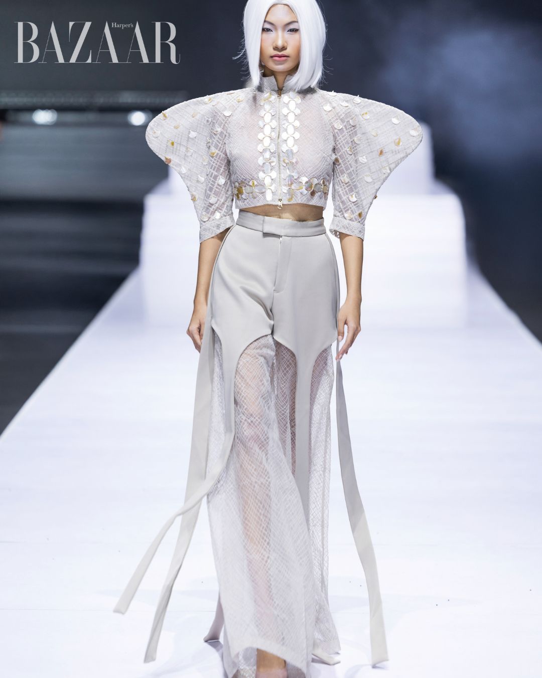 Hai thiết kế mở màn và kết màn của Francis Libiran đã thể hiện sự đối lập đẳng cấp, sử dụng kỹ thuật thủ công tinh xảo. Mở đầu là Quán quân The Face Vietnam 2023 Huỳnh Tú Anh diện một chiếc đầm ngắn (mini dress) màu trắng hiện đại, cá tính. Điểm nhấn là phần vai bồng lớn được đính kết cầu kỳ, kết hợp cùng chi tiết khóa kéo và quần tất họa tiết hình thoi độc đáo, mang đến sự phá cách, mạnh mẽ và thời thượng.