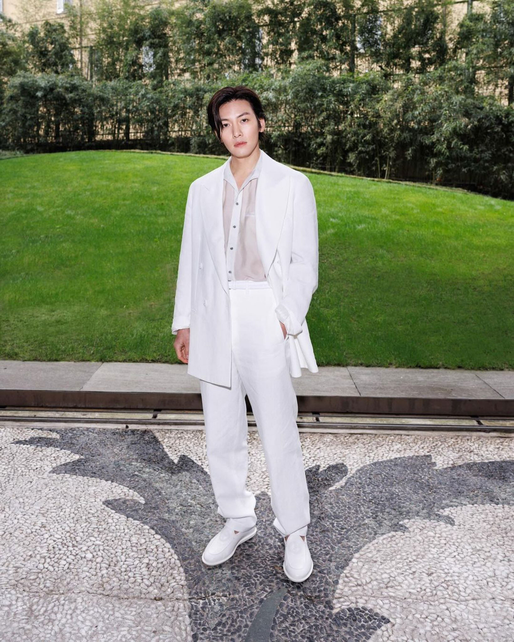 Xuất hiện tại show diễn Giorgio Armani Thu Đông 2024, Ji Chang Wook gây ấn tượng với trang phục đồng bộ màu trắng. Phong cách của ngôi sao sinh năm 1987 được đánh giá bắt nhịp nhanh với xu hướng thời trang monochrome, nhấn mạnh sự tổng thể được các sao lăng-xê trên hàng ghế đầu dạo gần đây.