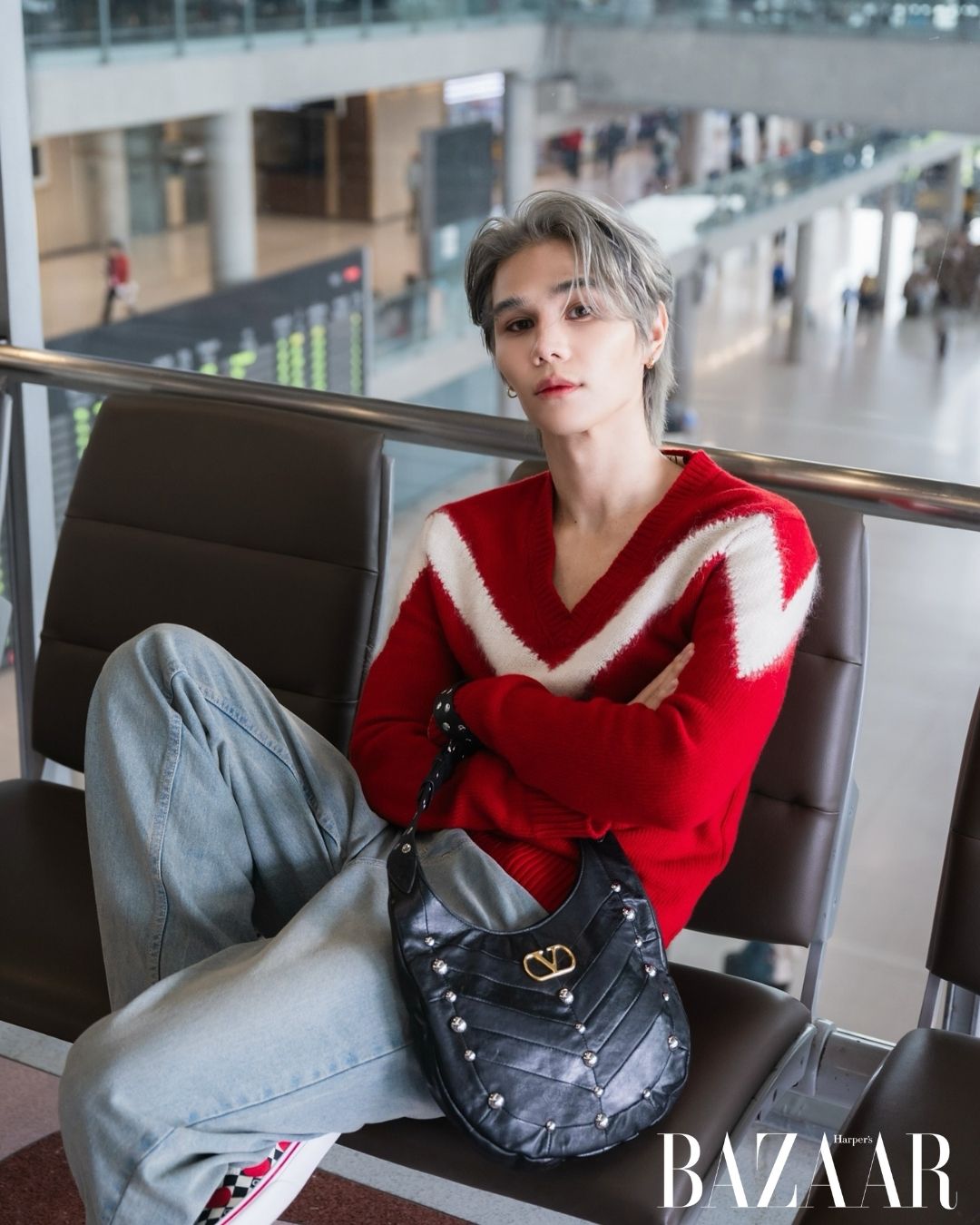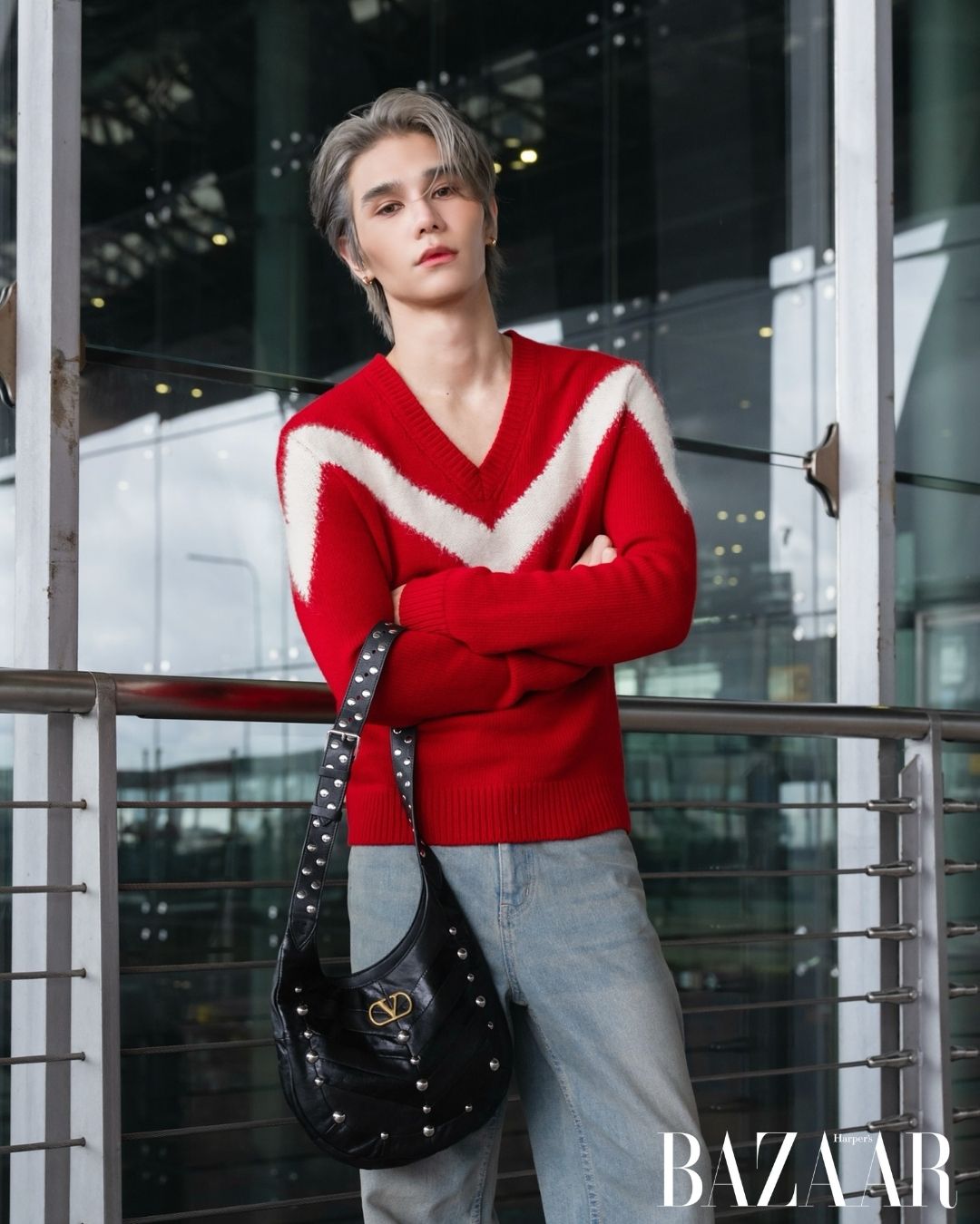 Tại sân bay trước thềm bay đi Paris, Jeff Satur lựa chọn phong cách tối giản nhưng đầy sức hút. Anh diện trang phục từ bộ sưu tập Valentino Thu Đông 2025/26 gồm áo len cổ chữ V màu đỏ rực với chi tiết họa tiết chữ V màu trắng chạy dọc vai và ngực phối cùng quần denim. Khi kết hợp với giày Valentino Garavani và chiếc túi Hobo đặc trưng của nhà mốt, tổng thể mang đến cảm giác thoải mái nhưng không kém phần sành điệu.