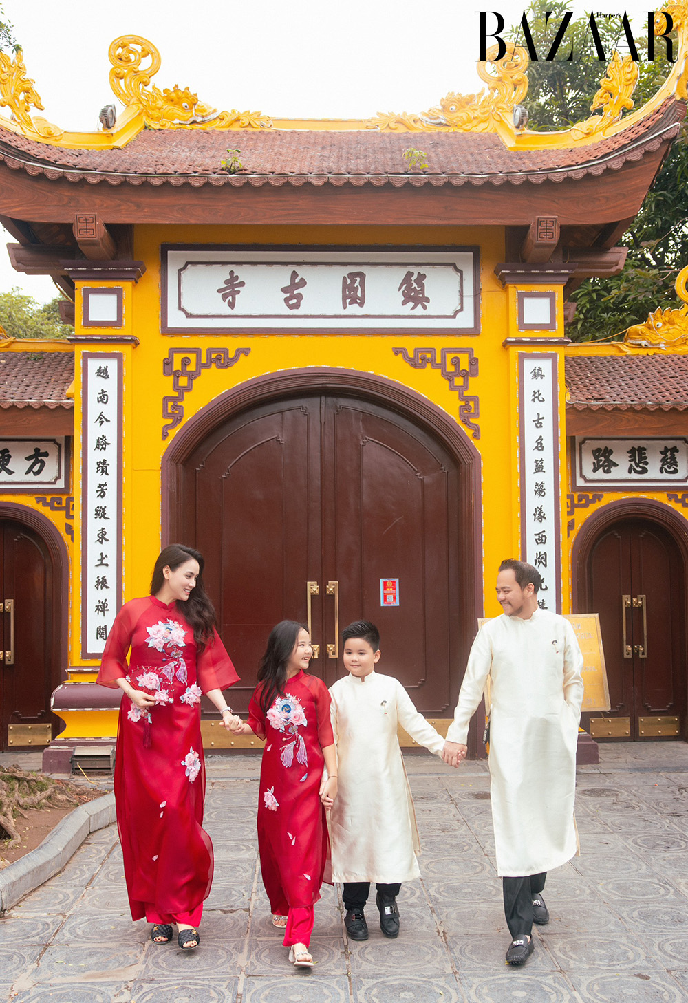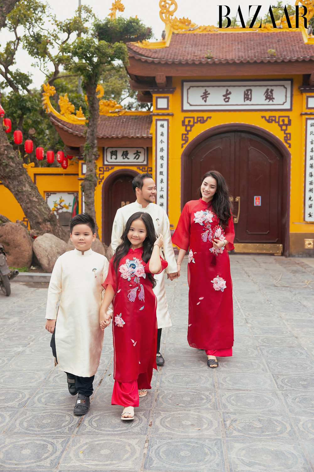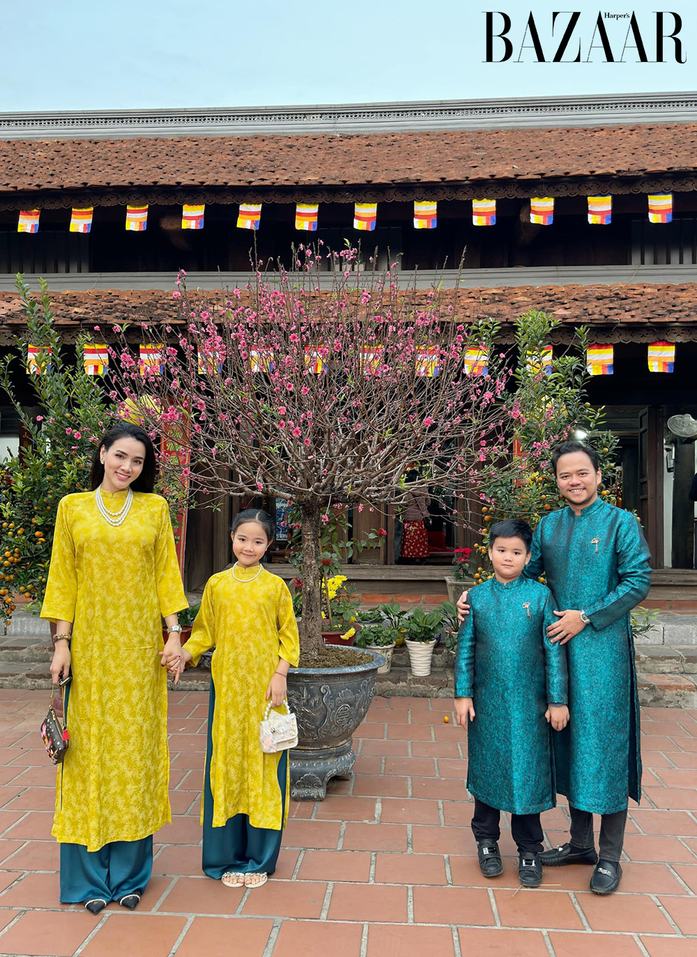 Trong ngày đầu năm, cả gia đình cùng diện áo dài đồng điệu. Mẹ và con gái chọn ái dài kiểu form suôn truyền thống còn bố và con trai có phần hiện đại hơn khi mặc áo lụa phối cùng quần jean.