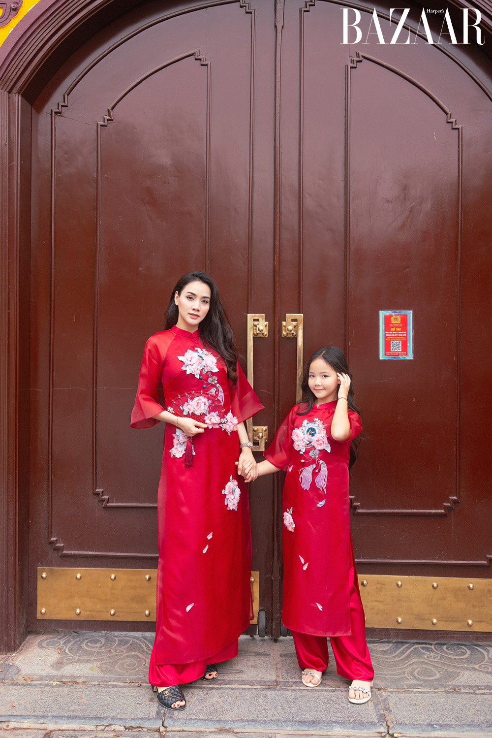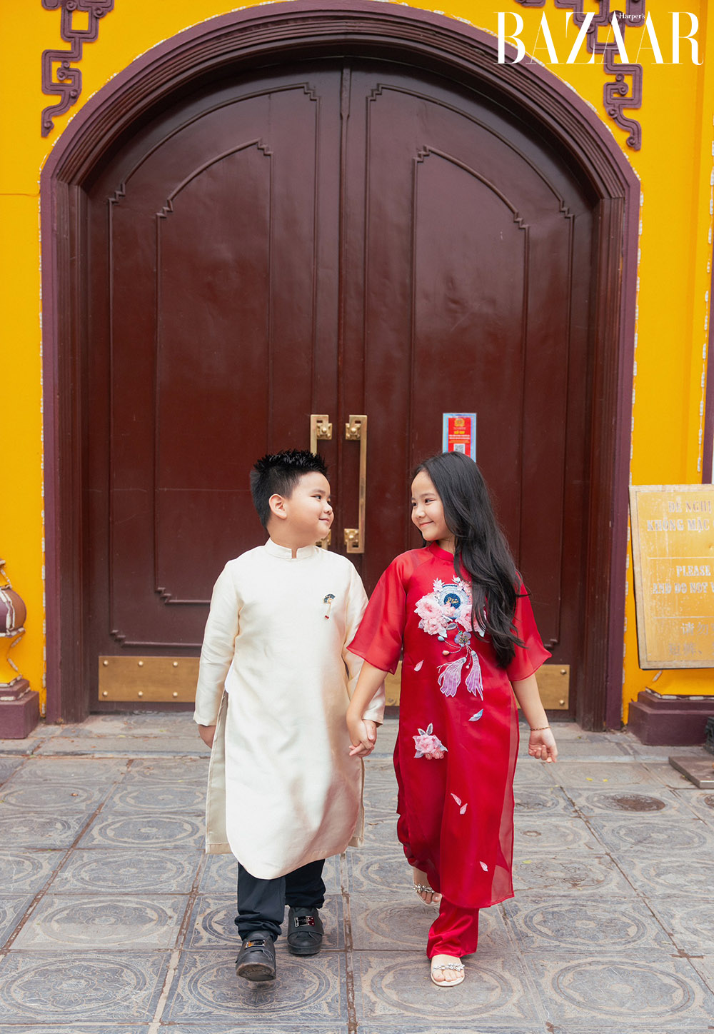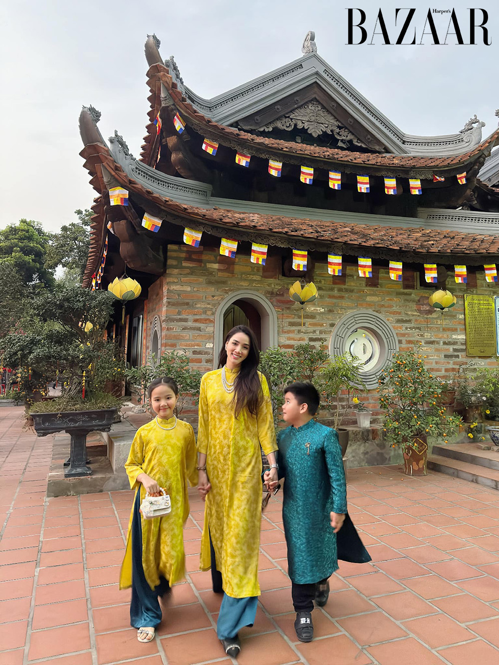 Trong ngày đầu năm, cả gia đình cùng diện áo dài đồng điệu. Mẹ và con gái chọn ái dài kiểu form suôn truyền thống còn bố và con trai có phần hiện đại hơn khi mặc áo lụa phối cùng quần jean.
