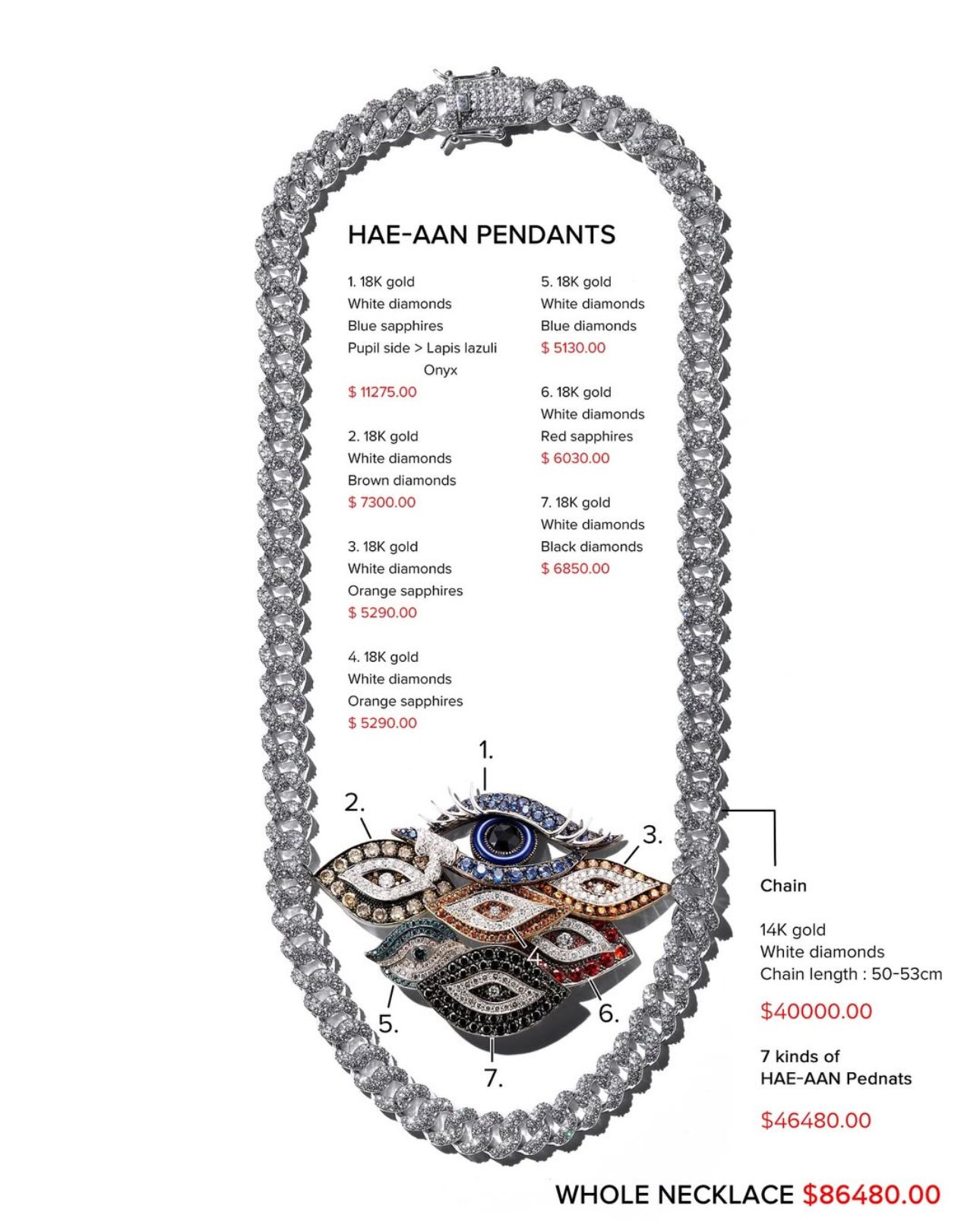 Cấu trúc chính của vòng làm từ vàng 14K, dài khoảng 50–53cm. Khắp vòng nạm kim cương nhí lấp lánh. Điểm nhấn của chiếc dây là bảy mặt dây chuyền mang hình dáng con mắt, mỗi chiếc mang một màu sắc và chất liệu khác nhau như sapphire xanh, đỏ, cam, kim cương đen hay đá onyx. Sự sắp đặt có vẻ ngẫu nhiên của những con mắt và màu sắc mang đến cảm giác huyền bí.