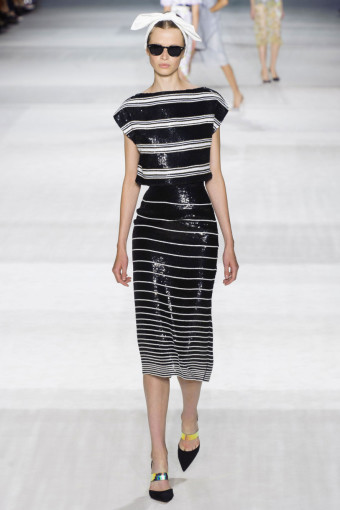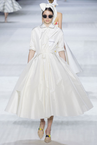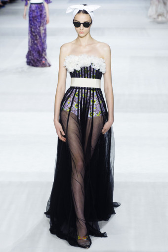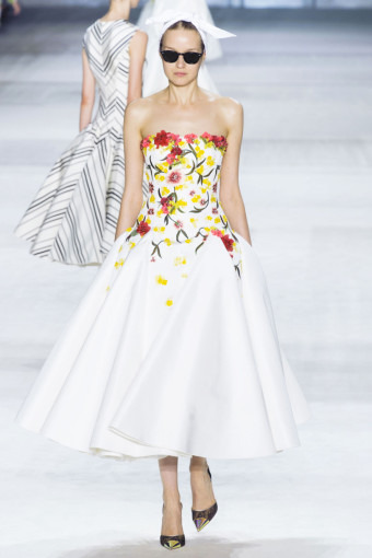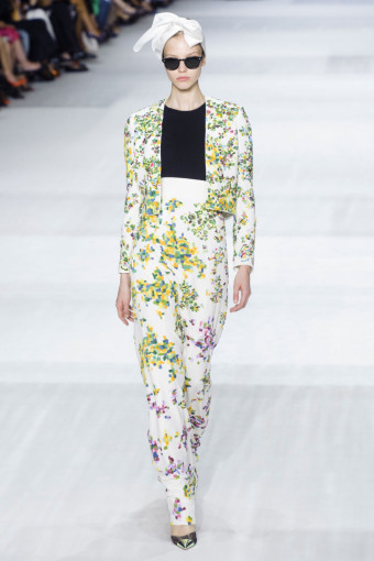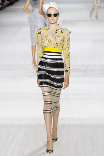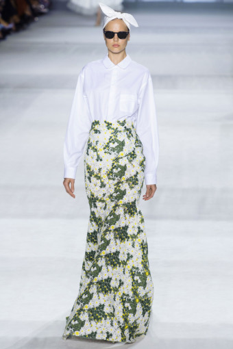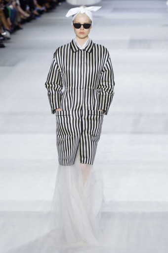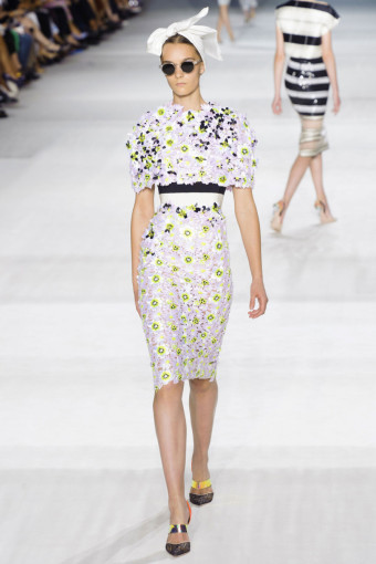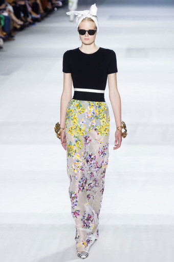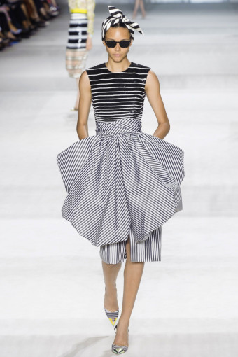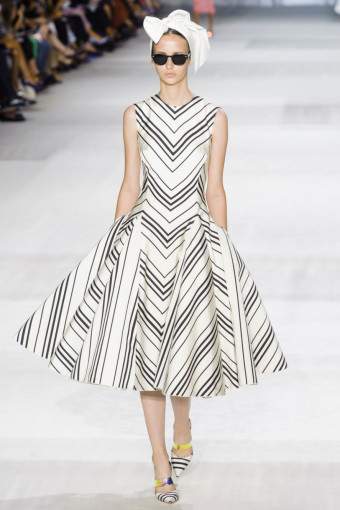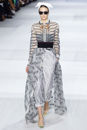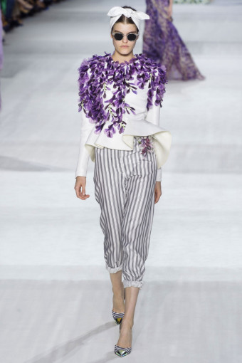 Ngoài hoa lá, kẻ sọc trắng đen cũng là một họa tiết nổi bật ở đây. Giambattista Valli đã thật khéo léo khi kết hợp hoa và kẻ sọc với nhau trên cùng một thiết kế, với thân áo ren thêu hoa và chân váy kẻ sọc mang lại hiệu ứng hài hòa bất ngờ.