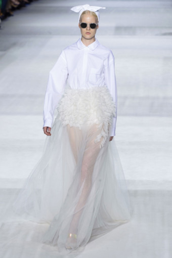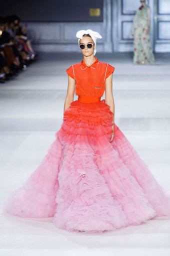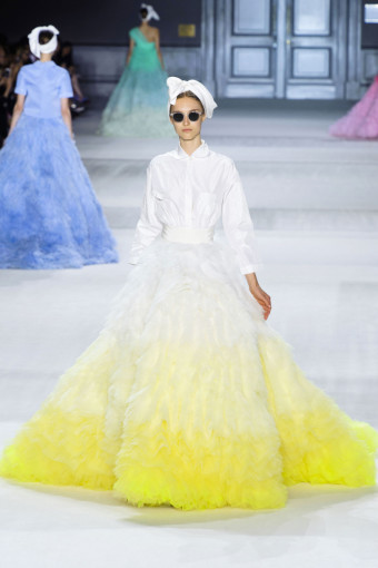 Nếu những thiết kế ở nửa phần đầu mang tính ứng dụng cao thì những thiết kế ở cuối là bước chuyển ngoạn mục sang những chiếc đầm dạ hội lộng lẫy. Sự giản dị được giữ lại ở phần thân trên, trong khi chân váy bên dưới có độ phồng và xòe rộng hết cỡ, được tạo nên bởi tầng tầng lớp lớp chất liệu vải tuyn kết hợp cùng lông nhuộm màu theo hiệu ứng ombré. “Đây sẽ là những thiết kế bán chạy nhất”, Giambattista Valli tự tin “phán” như thế, bởi vì quả thật, chúng sẽ là chiếc áo cưới rất tuyệt cho những cô dâu muốn tìm sự phá cách trong ngày cưới của mình.