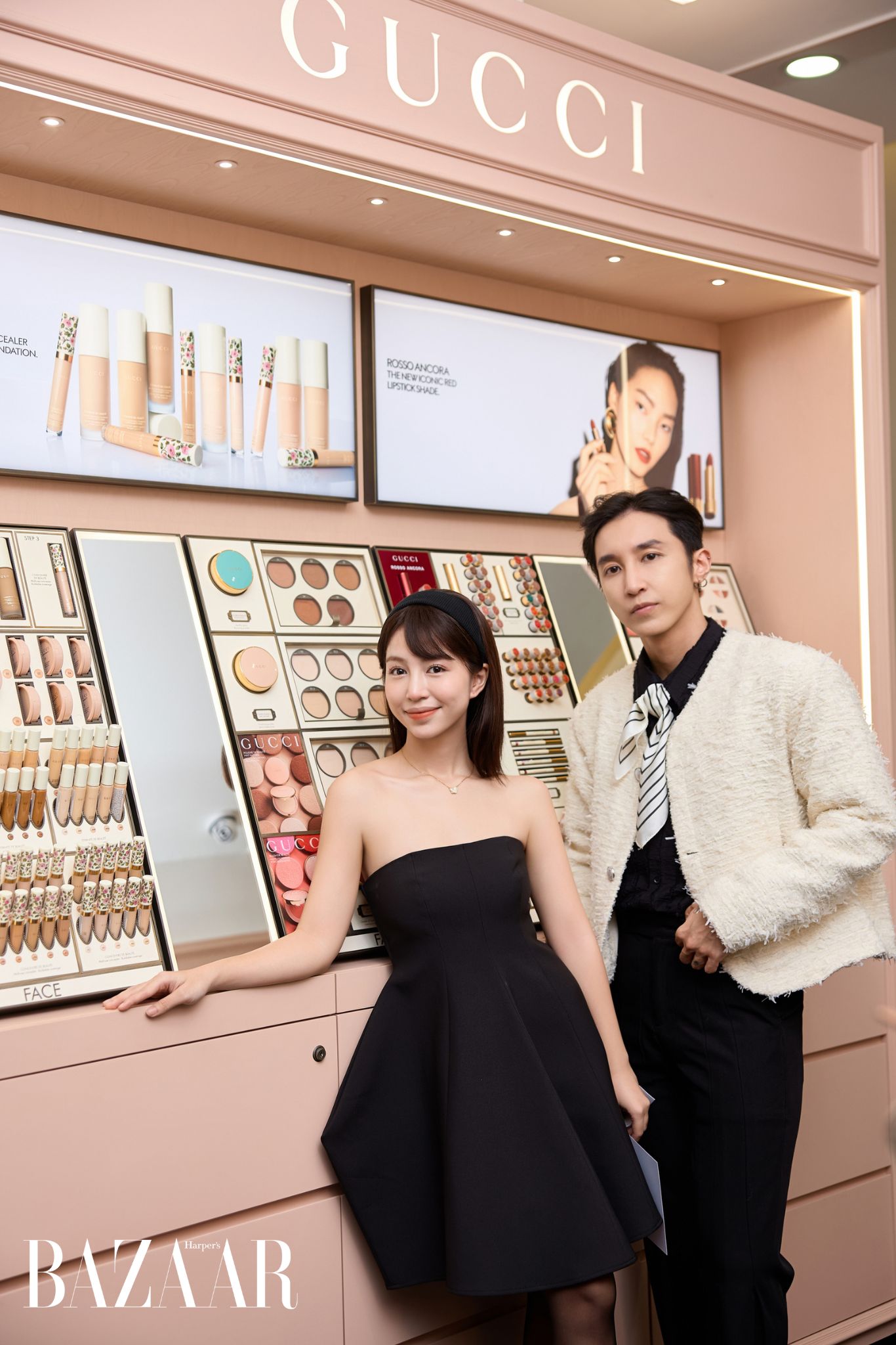 - Ca sĩ Key cùng Mẫn Tiên tại quầy makeup Gucci Beauty. Ảnh Gucci Beauty