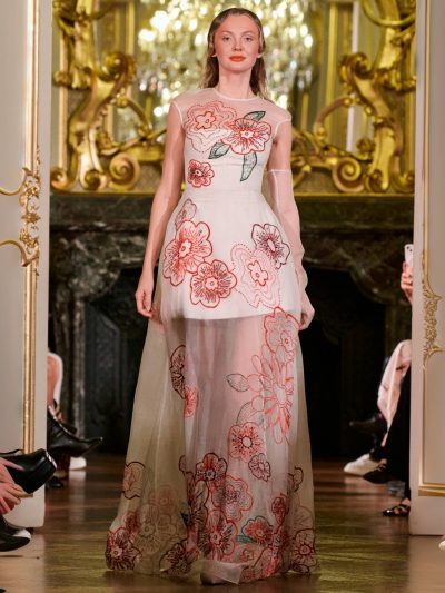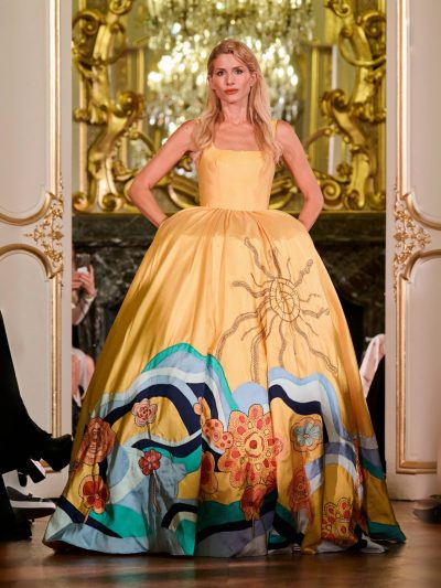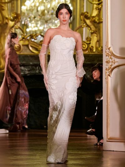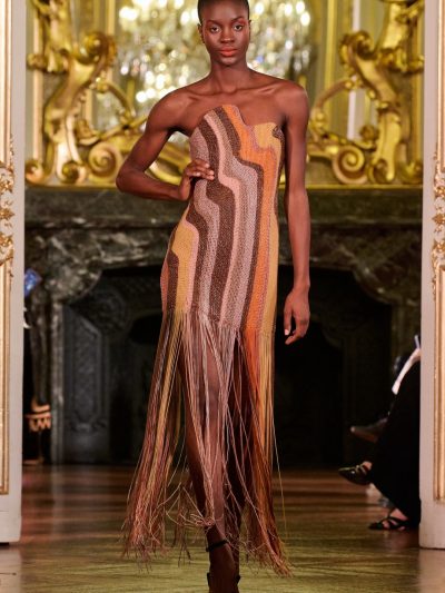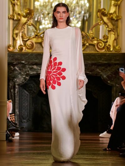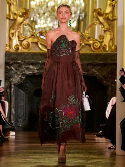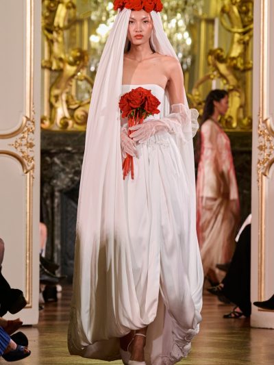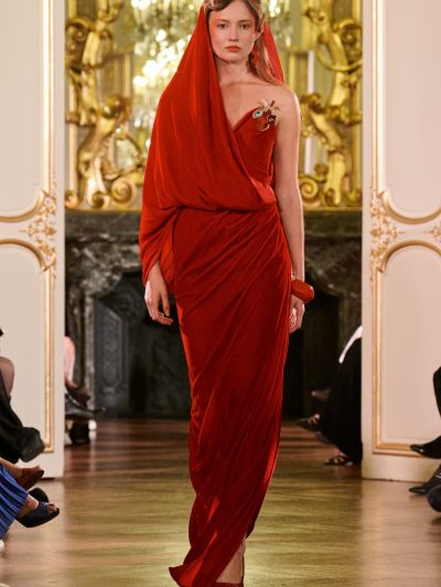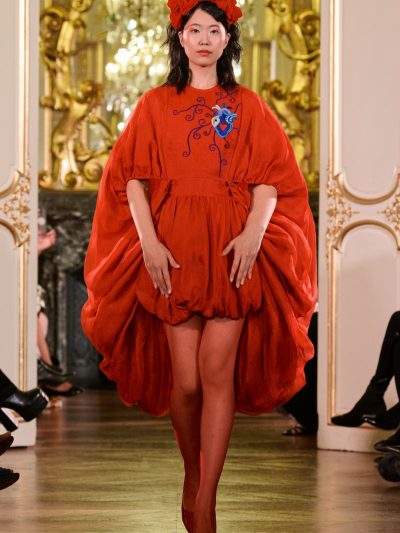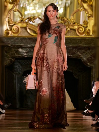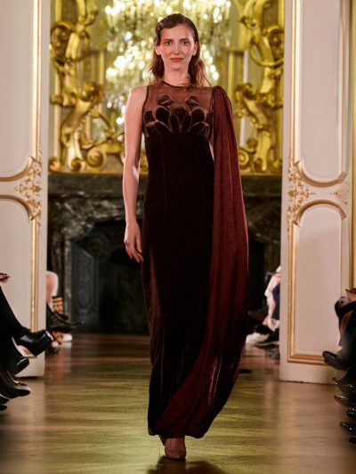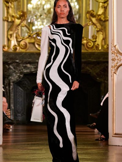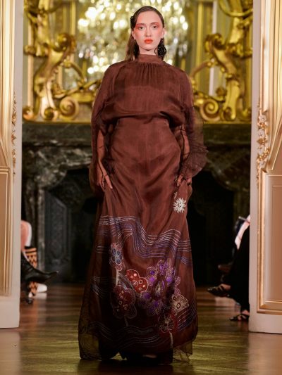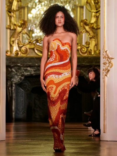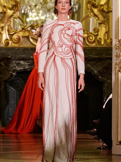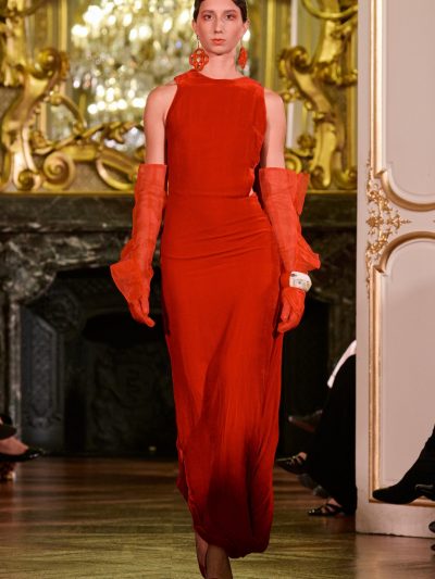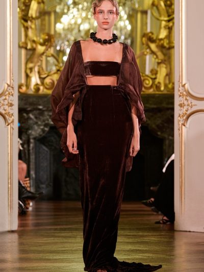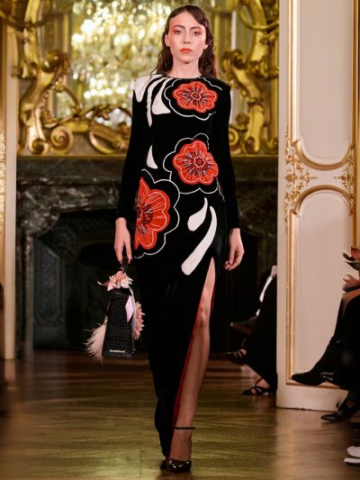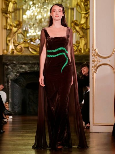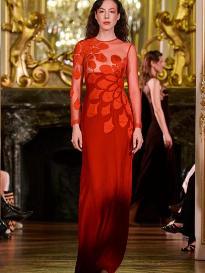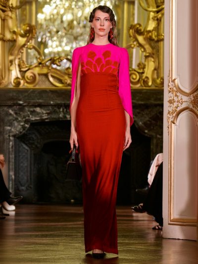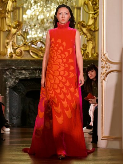 Nhung và lụa – vốn là dấu ấn đặc trưng của thương hiệu – nay được tái sinh trong bảng màu lộng lẫy: đỏ ruby, đen huyền, cùng những gam bùng nổ ảo giác như hồng fuchsia, cam và vàng ánh kim. Các thiết kế mang cấu trúc phi đối xứng tự do, biến hóa giữa sự trong veo bay bổng và những khối dáng điêu khắc.