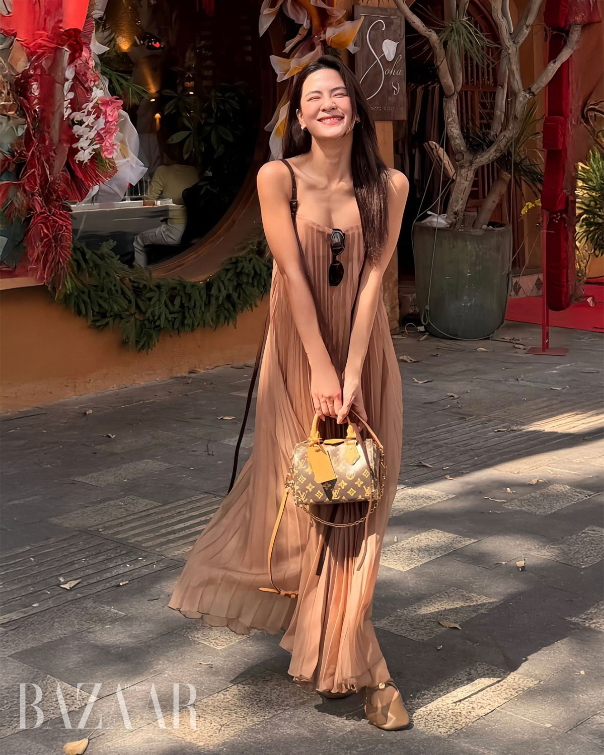 Trong loạt ảnh street style đăng tải ngày đầu năm, Hà Nhi xuống phố cùng trang phục phong cách đơn sắc (monochrome). Chiếc váy xếp ly dài chấm đất màu cà phê sữa, đôi giày da màu nâu đồng điệu, và chiếc túi xách Louis Vuitton Speedy Trunk 20 từ BST kỷ niệm 130 năm ra mắt họa tiết Monogram trứ danh của nhà mốt Pháp.
