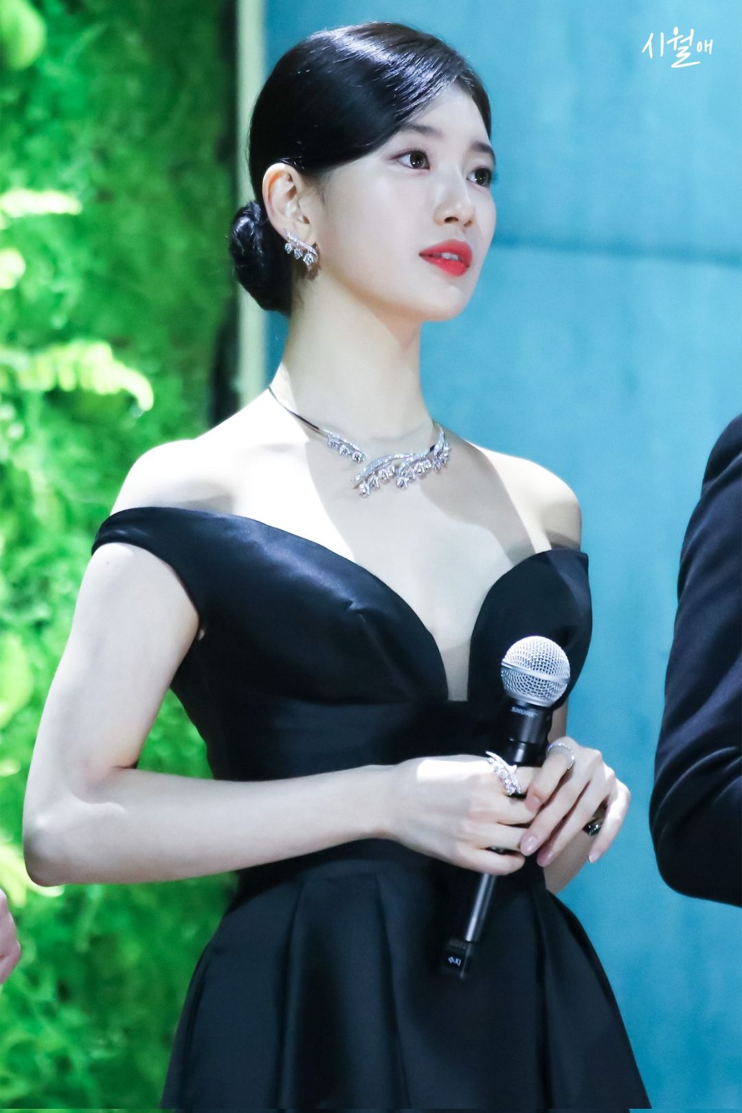 - Năm 2019, tại Baeksang lần thứ 55, Suzy dự thảm đỏ với váy Mikael D, Trang sức thương hiệu Chaumet từ BST Joséphine Aigrette, trang sức Laurier. Ảnh: Dispatch