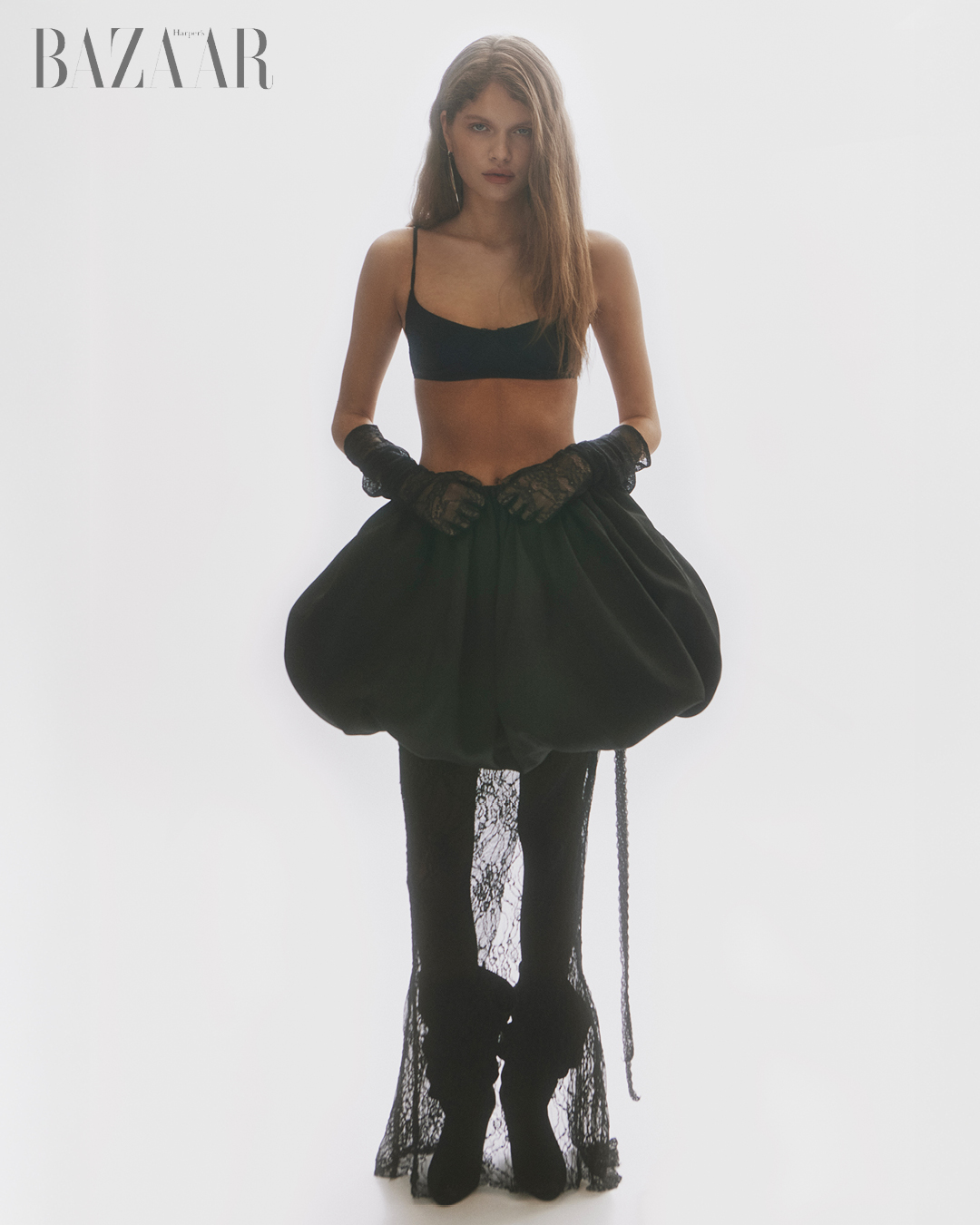 Top and skirt: Julia Weström. Gloves: Handsome Stockholm. Earrings: Stylist’s archive.