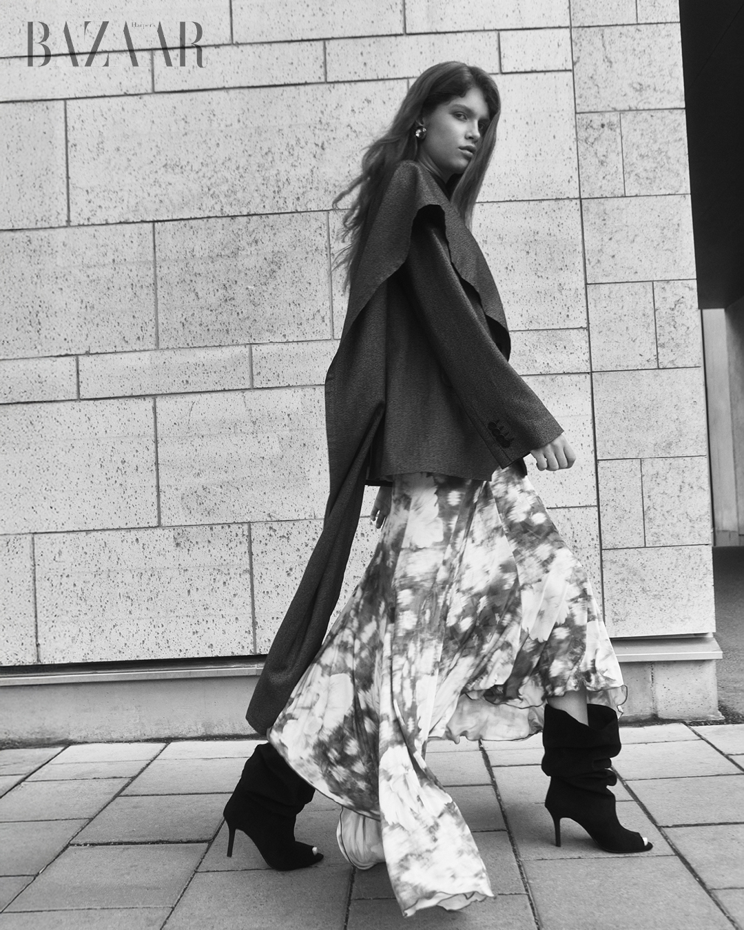 Blazer and dress: Rodebjer. Gloves: Handsome Stockholm. Shoes and earrings: Stylist’s archive.