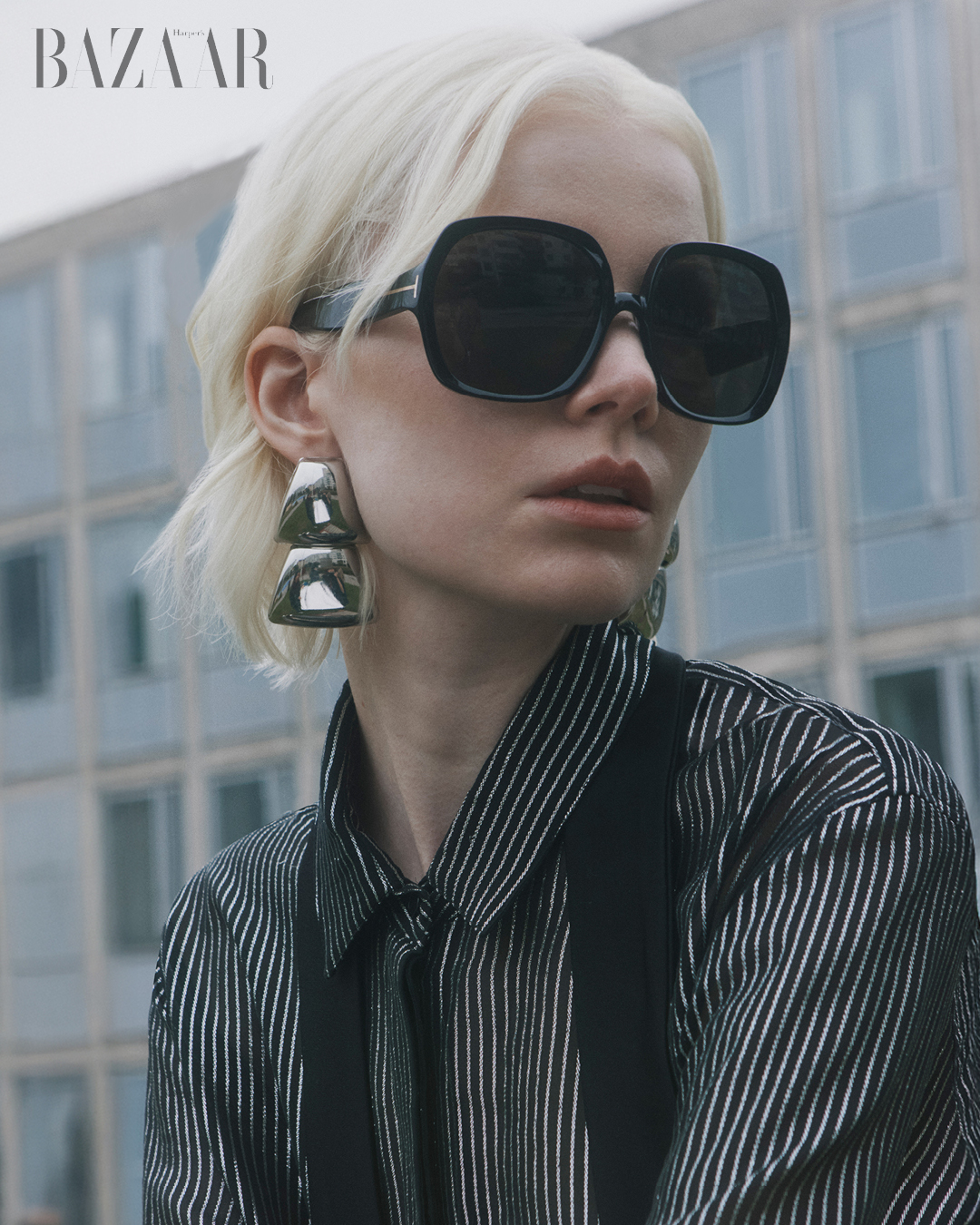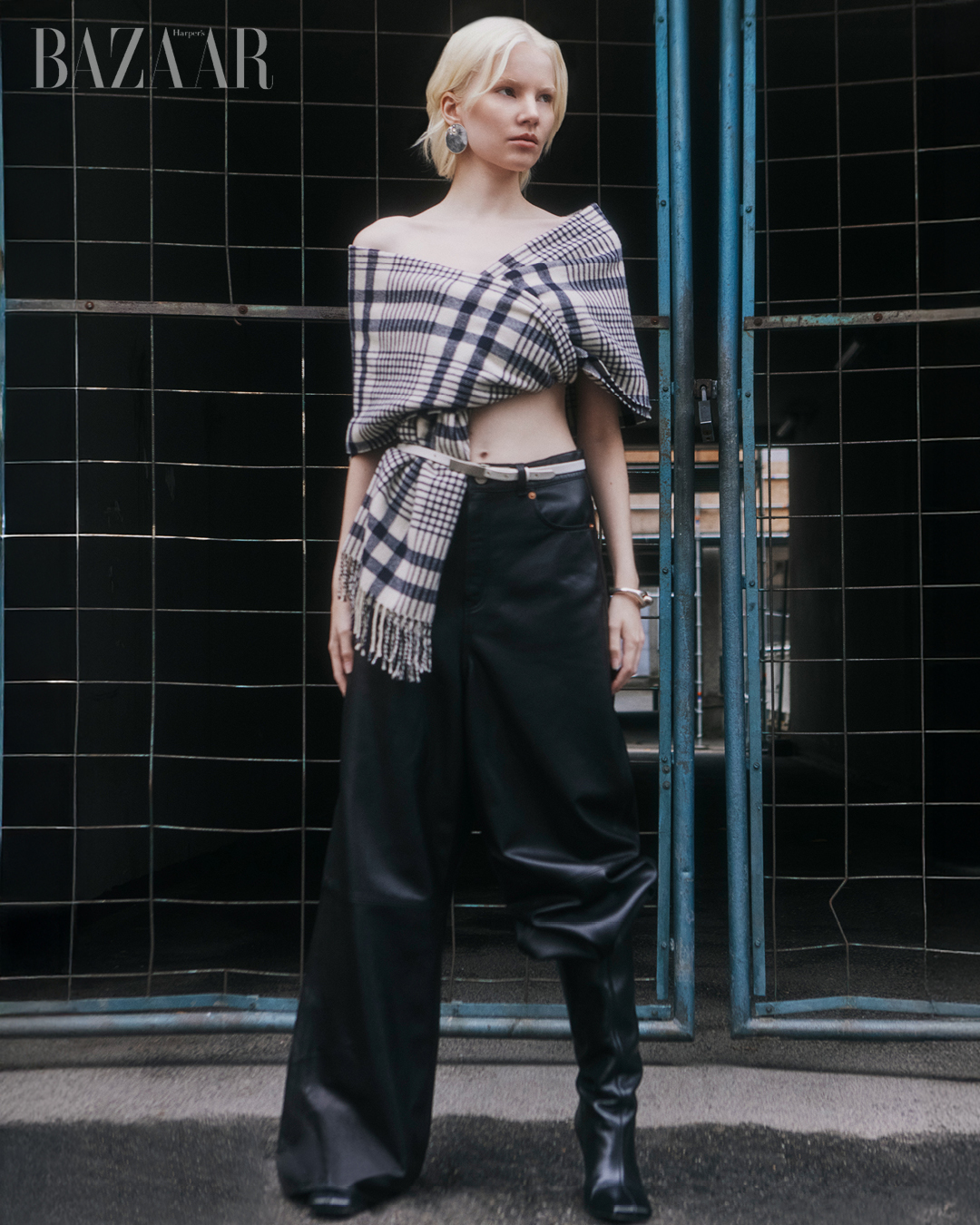 Top & belt: Acne Studios. Pants: Teurn Studios. Boots: Rodebjer. Earrings and bracelet: Efva Attling.