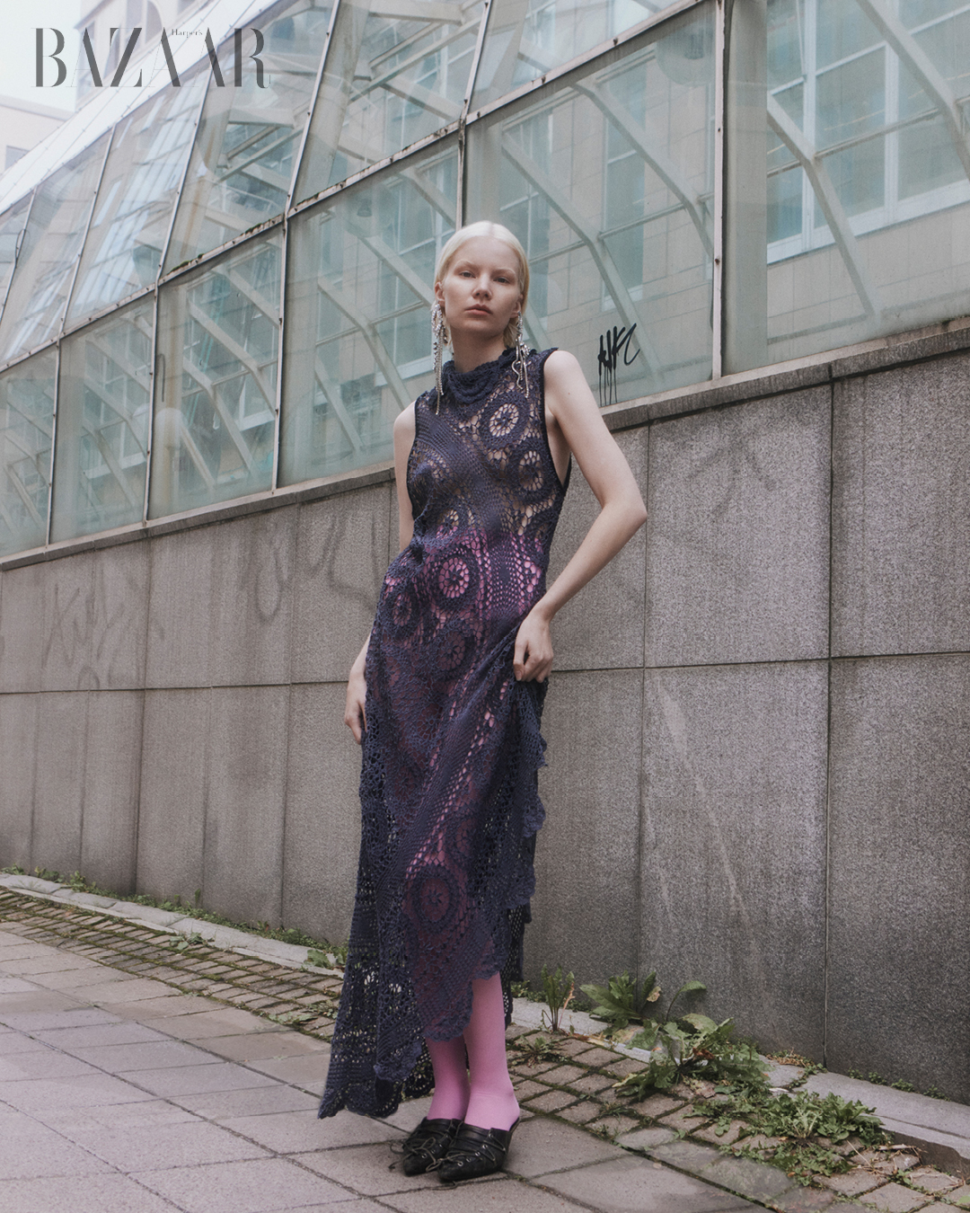 Dress: Remake Sthlm. Stockings: Swedish Stockings. Shoes: Acne Studios. Earrings: Stylist’s archive.