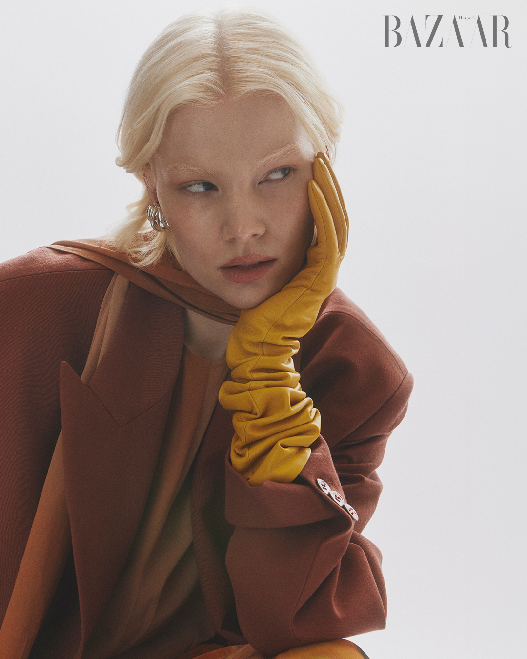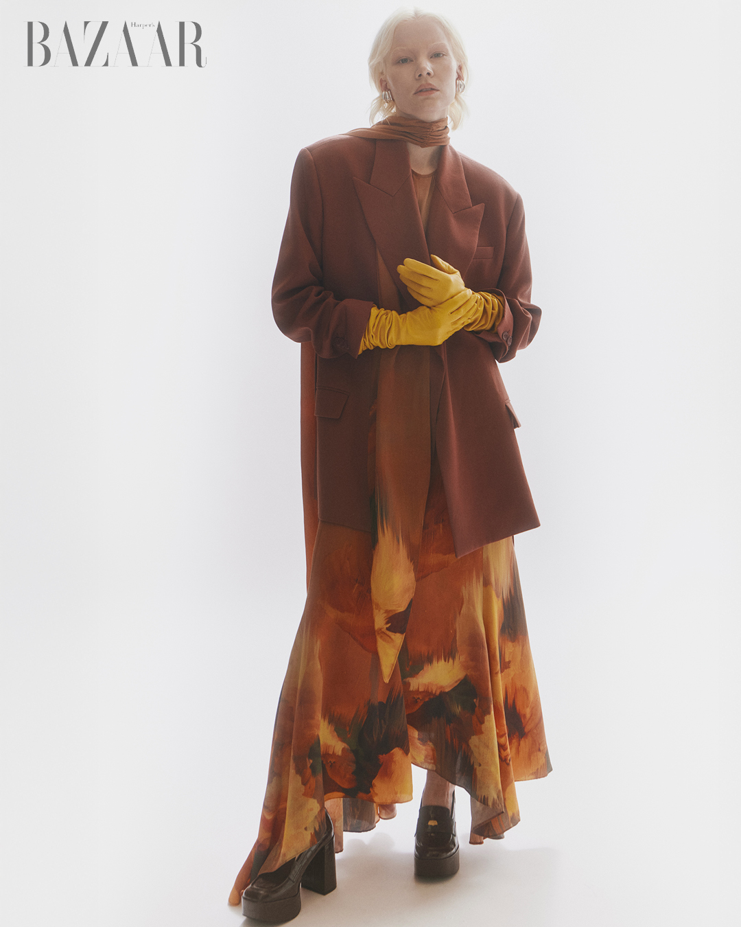 Blazer and dress: Rodebjer. Gloves: Handsome Stockholm. Earrings: Stylist’s archive.