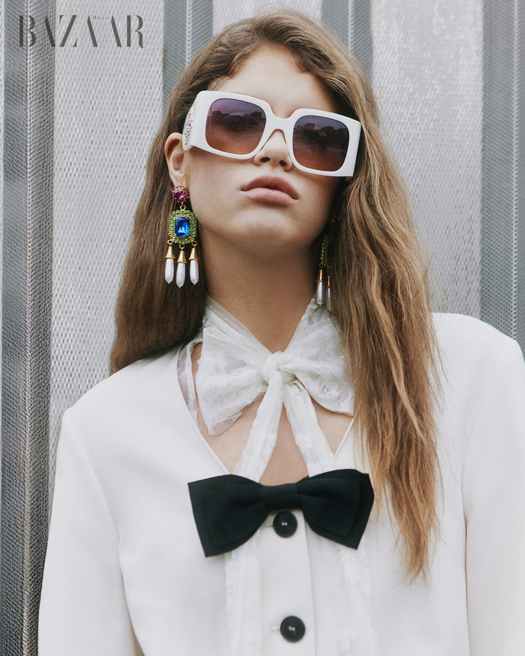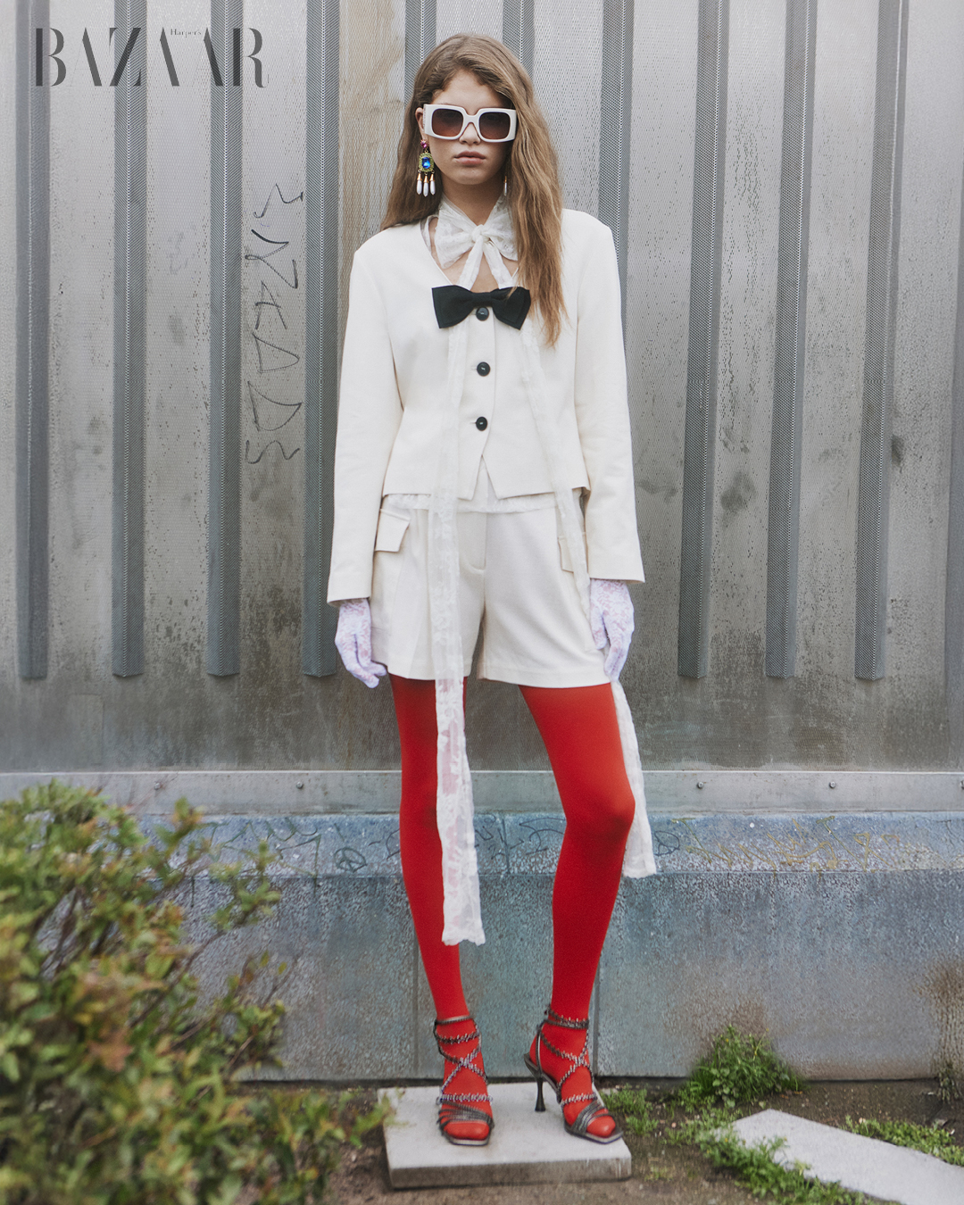 Lace top: Remake Sthlm. Blazer, shorts & gloves: Valentino.