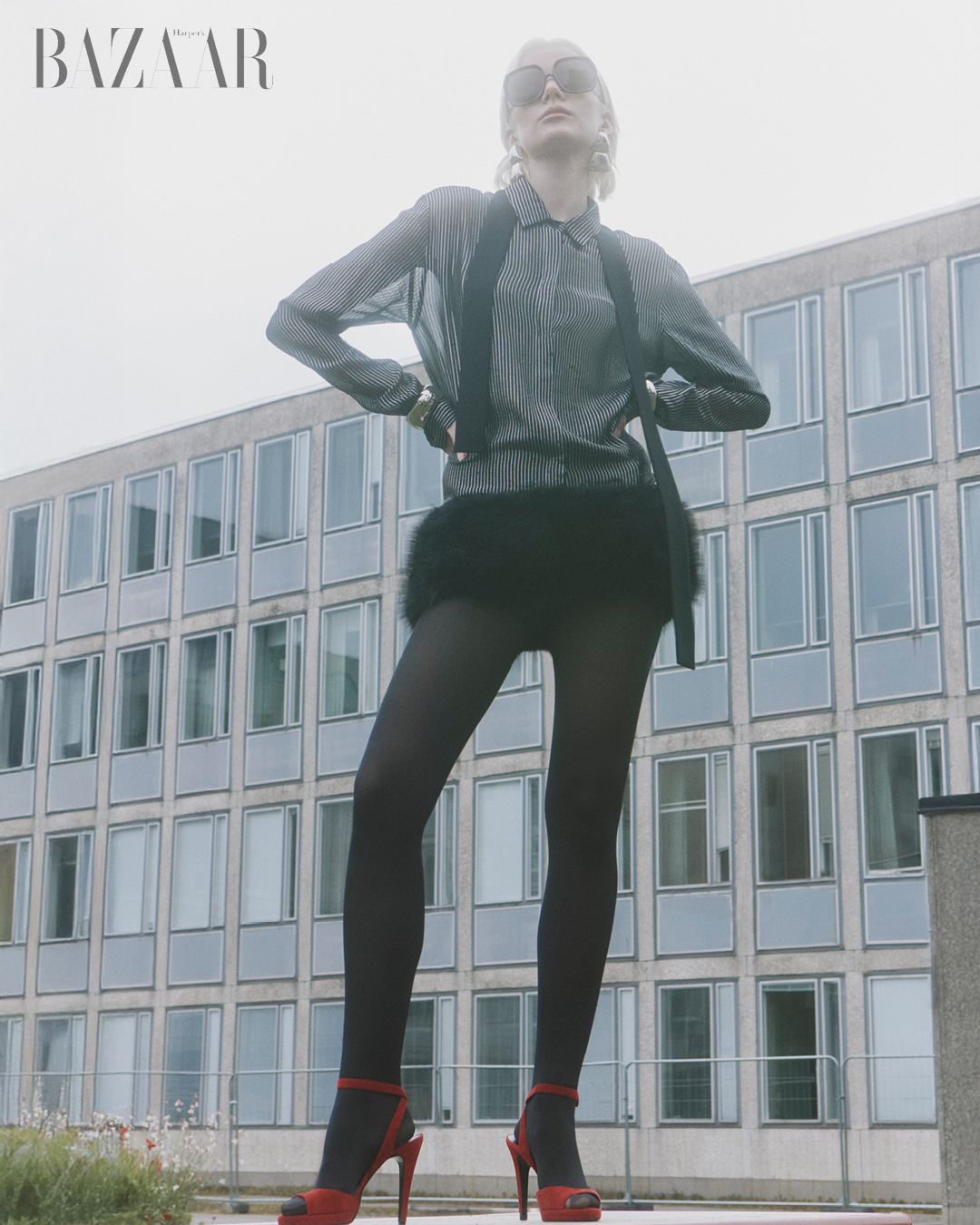 Lace top: Remake Sthlm. Blazer, shorts & gloves: Valentino. Stockings: Swedish Stockings. Shoes: Stylist’s archive.