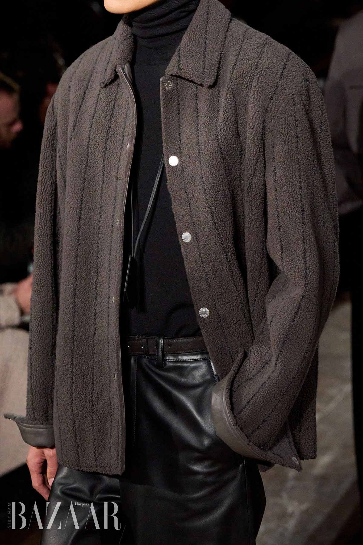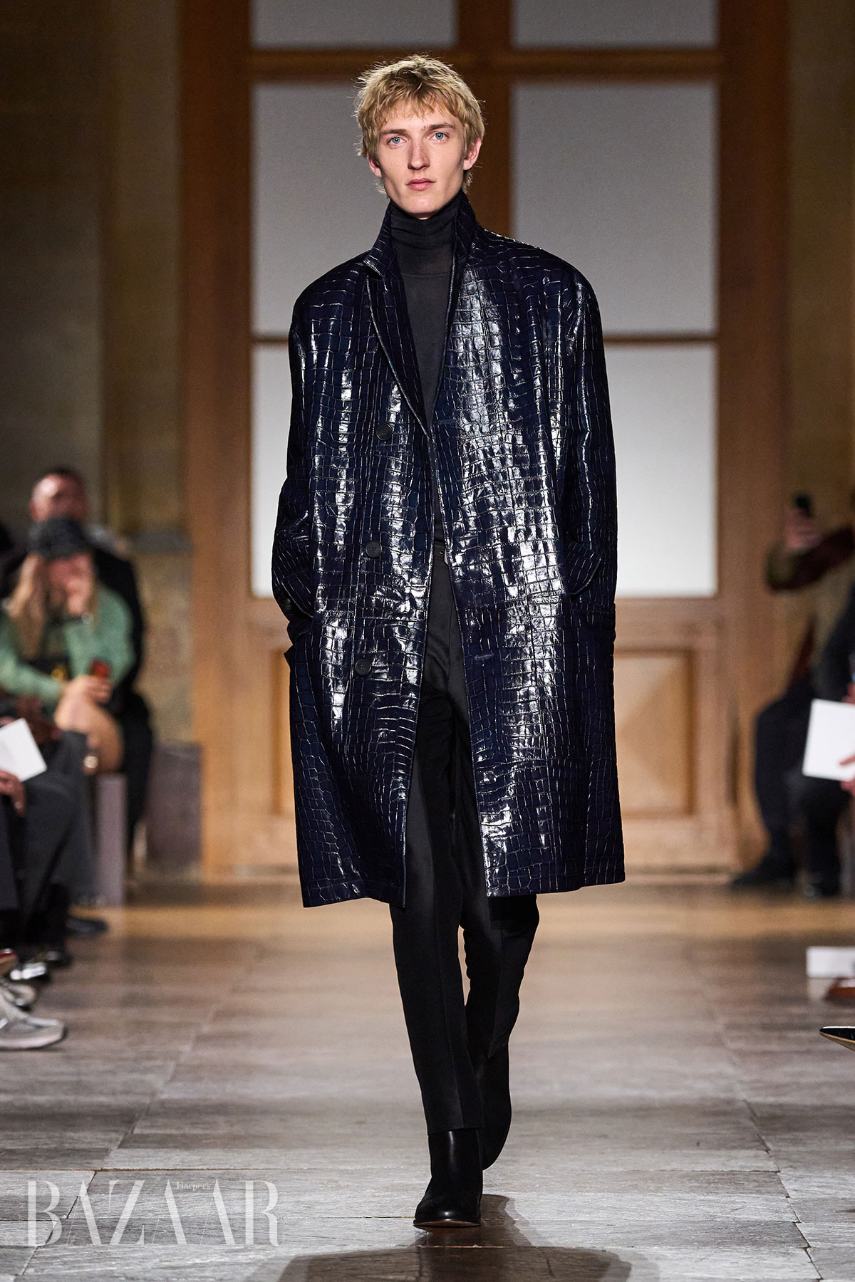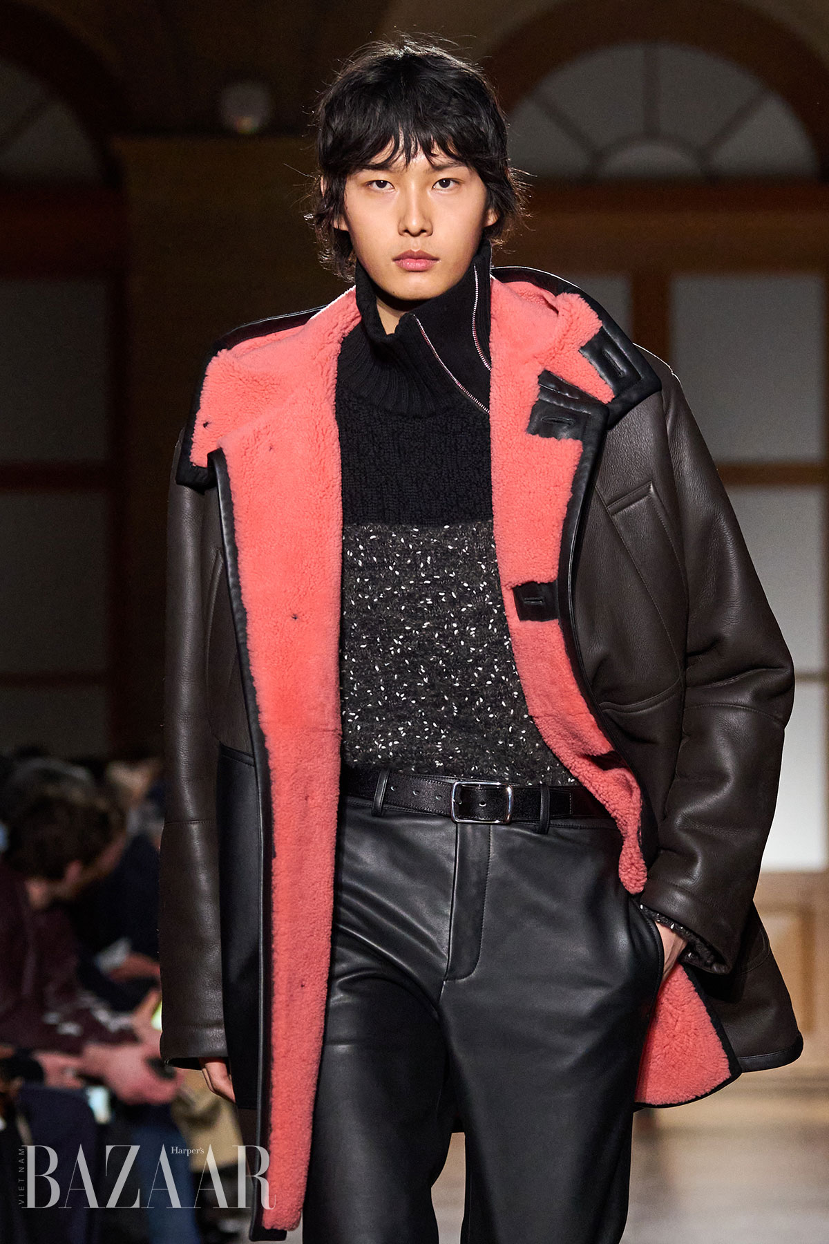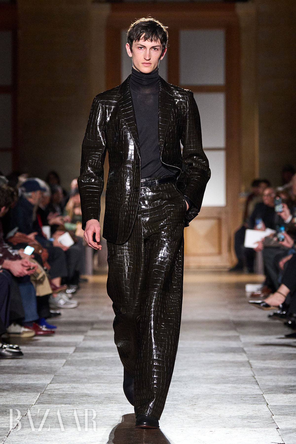 Ấn tượng nhất là bộ suit làm từ chất liệu da cá sấu bóng loáng, được mài bóng từ agate. Những chiếc áo khoác màu cam và vàng, có mảng miếng lông cừu shearling nổi bật, mang đến cảm giác vui tươi.