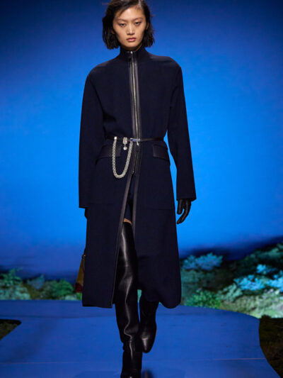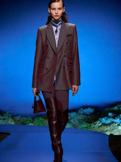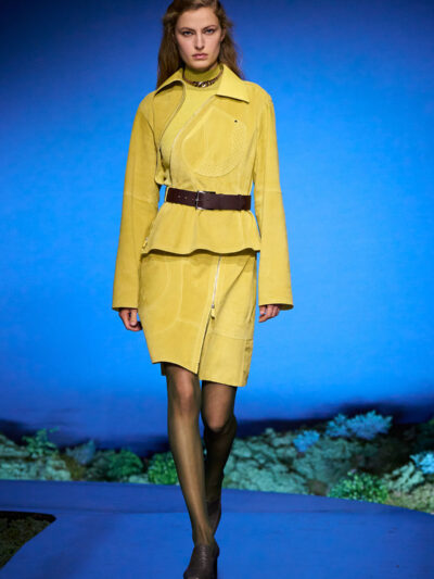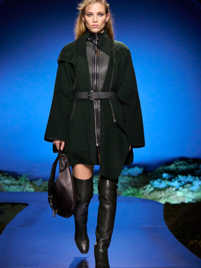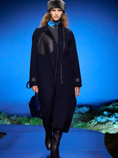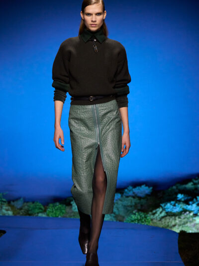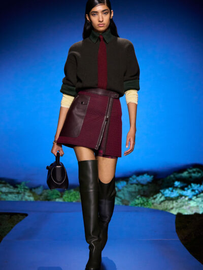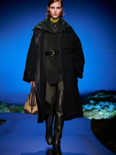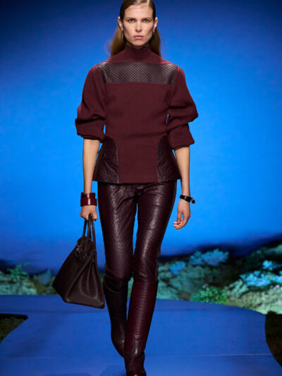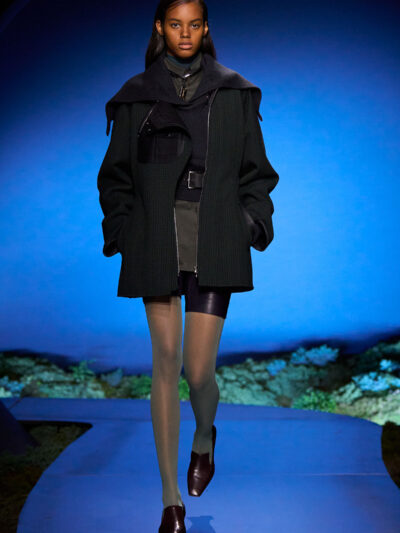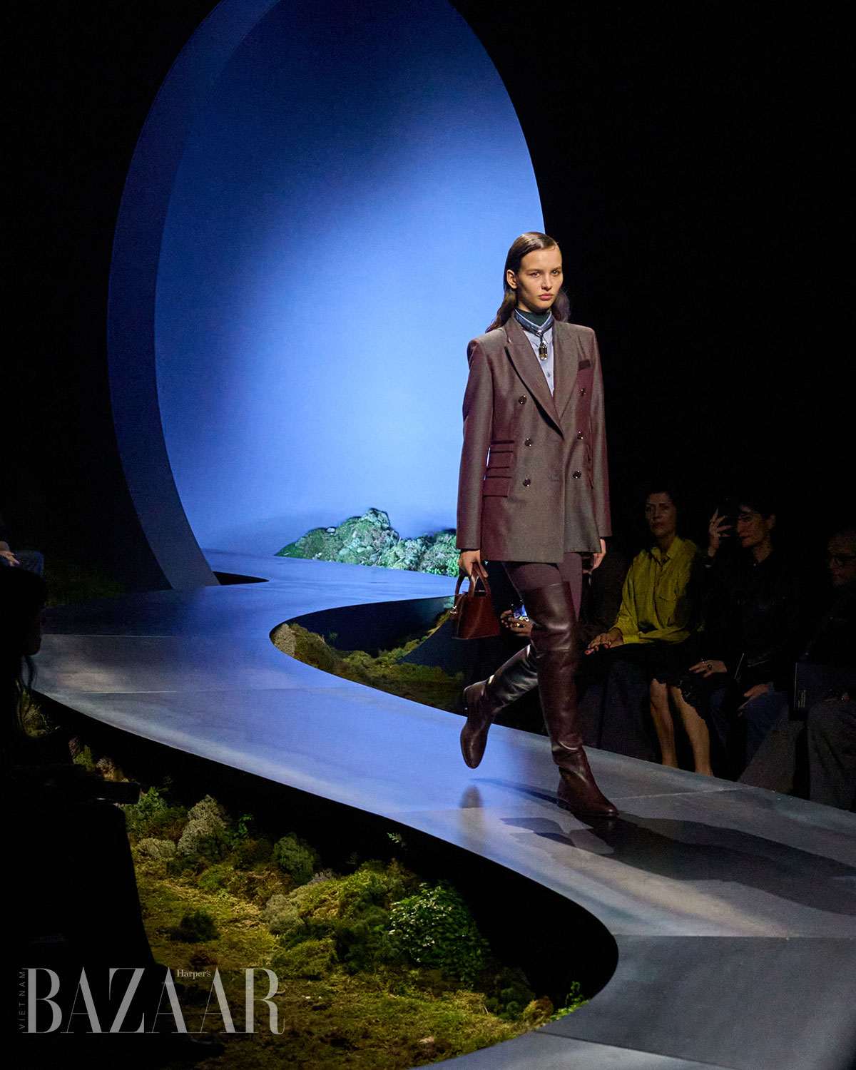Cho bộ sưu tập thời trang nữ của Hermès mùa Thu Đông 2026, Nadège Vanhee-Cybulski muốn khám phá những khoảnh khắc ngắn ngủi giữa ngày và đêm, khi bóng tối hình thành, màu sắc thay đổi, và mọi thứ không còn mang hình dáng của ban ngày. Vì vậy, bà tái hiện một khung cảnh lúc chạng vạng ngay bên trong tòa nhà Garde Républicaine, nơi các khách mời tìm chỗ ngồi đặt quanh sàn runway chạy vòng vèo như một mê cung giữa các thảm rêu xanh. Không gian huyền bí như một khung cảnh từ chuyện cố tích.