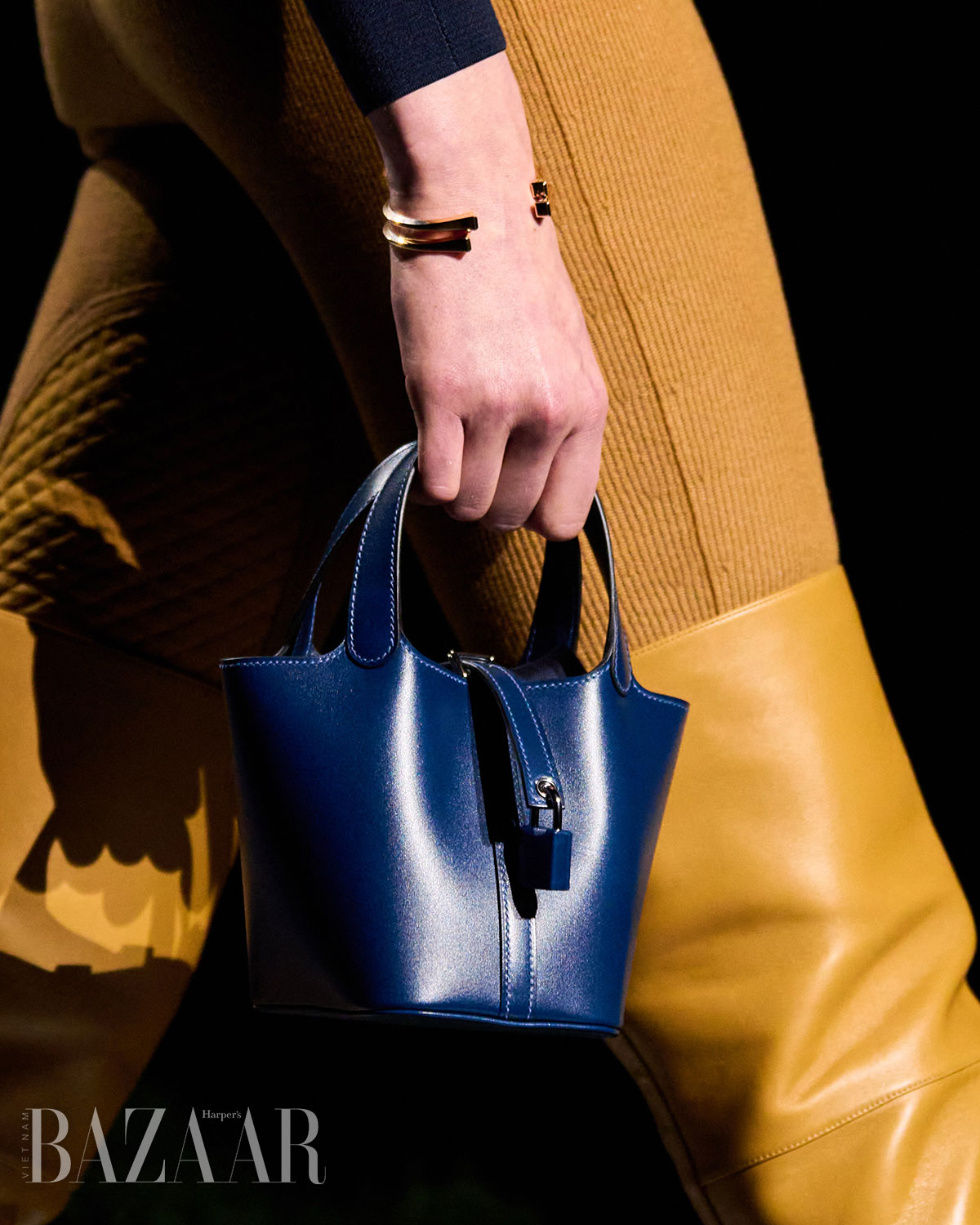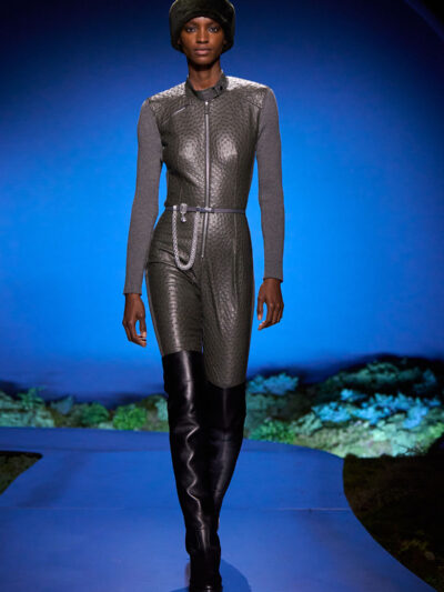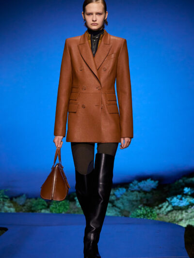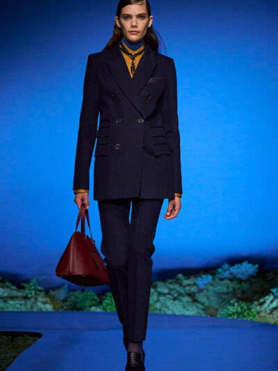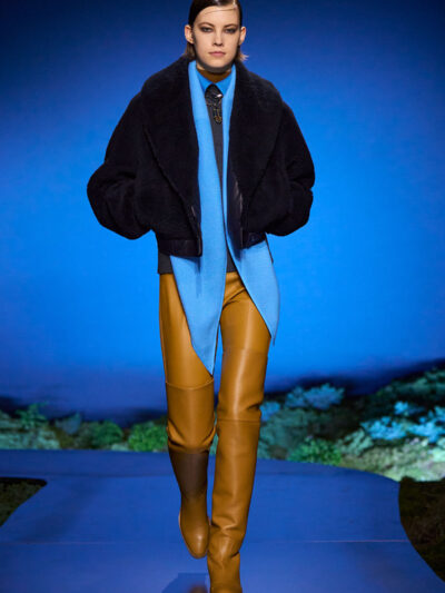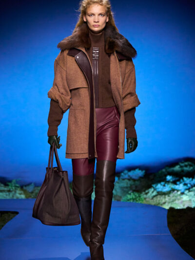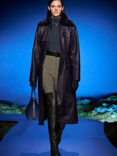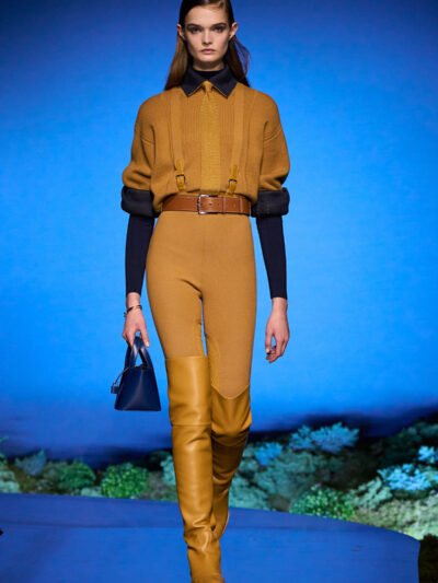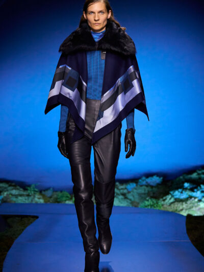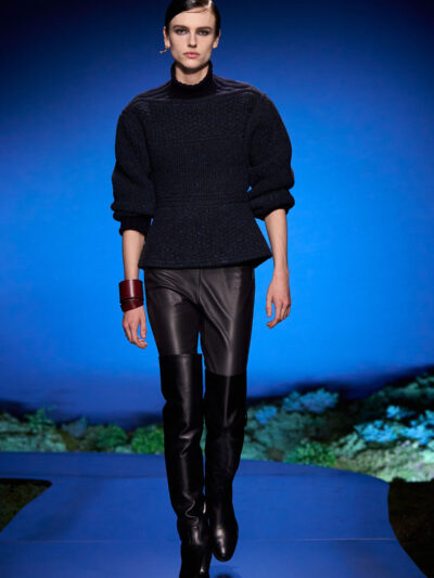 Các người mẫu ùa ra từ hậu trường và trình diễn trên sàn catwalk uốn lượn, diện những bộ trang phục thích hợp cho một buổi tối khám phá ngoài trời. Trang phục mang tinh thần quân đội, với áo choàng bằng da mềm, quần yếm và quần johdpur phù hợp để cưỡi ngựa. Những đôi bốt da cao quá đùi cực kỳ quyến rũ, khi chất liệu phản chiếu ánh sáng về đêm. Bảng màu đậm như hòa vào màn đêm, điểm xuyết bằng những gam màu nổi bật. Chạng vạng là khi “bóng đêm không thể bị giản lược thành màu đen”, như Hermès ghi chú.