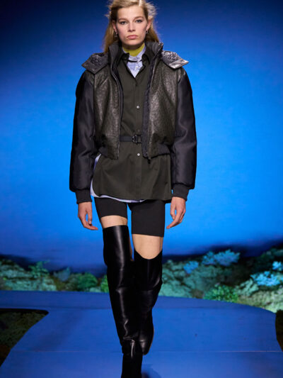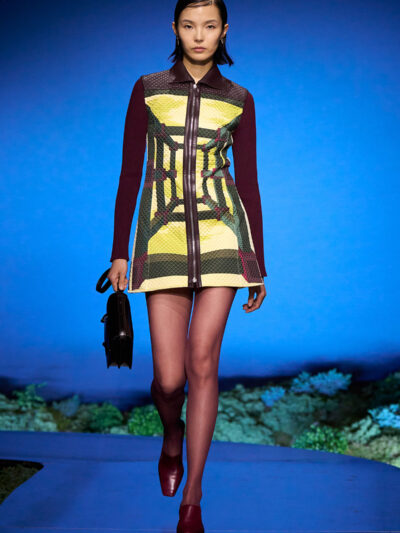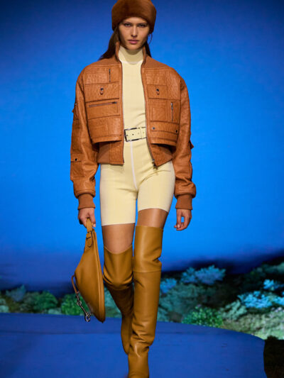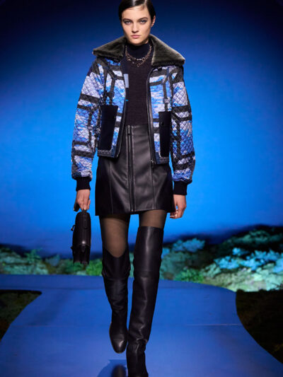 Họa tiết lặp lại theo phong cách mise-en-abyme* này được lồng ghép xuyên suốt bộ sưu tập, xuất hiện trên những chiếc khăn vuông được mặc như áo choàng hoặc thắt lỏng lẻo ở vai, cũng như trên áo gile chần bông, áo khoác bomber và áo sơ mi khoác ngoài.