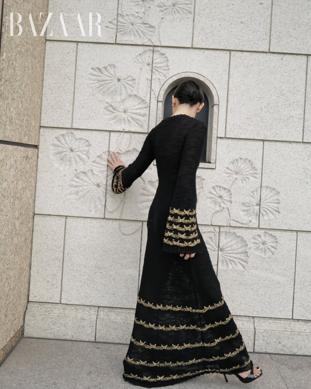 Look số 44 là bản giao hưởng giữa sự sang trọng cổ điển và nghệ thuật thủ công tinh xảo. Chiếc váy được dệt từ len nguyên chất với hiệu ứng xuyên thấu nhẹ, tay loe và phom dáng suông mềm mại. Những đường thêu ánh vàng chạy dọc ống tay và chân váy phản chiếu ánh đèn, khiến từng bước đi của Hồ Thu Anh thêm phần cuốn hút trước ống kính quốc tế.