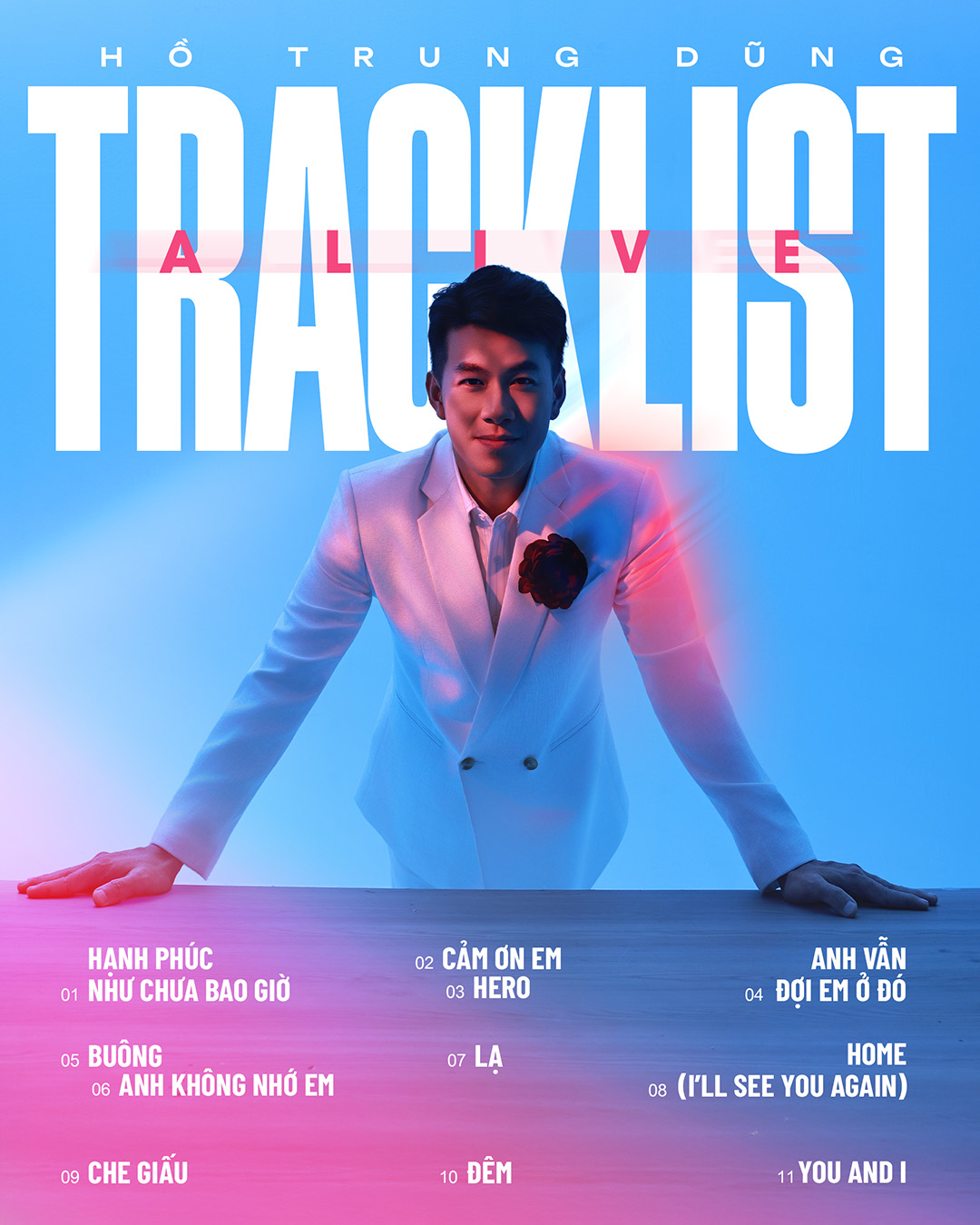 Tối 30/12/2025, trong không gian ấm cúng và tinh tế của buổi Listening Space ra mắt album, Hồ Trung Dũng xuất hiện với hình ảnh quen thuộc: vest đen lịch lãm, phong thái điềm đạm, và điểm nhấn là bông hoa hồng đen cài trên ngực áo. Biểu tượng ấy như một lời dẫn nhập đầy ẩn dụ cho tinh thần của ALIVE – sự đối lập giữa mạnh mẽ và mong manh, giữa ánh sáng và bóng tối, giữa những tổn thương sâu kín và khát khao được sống trọn vẹn.