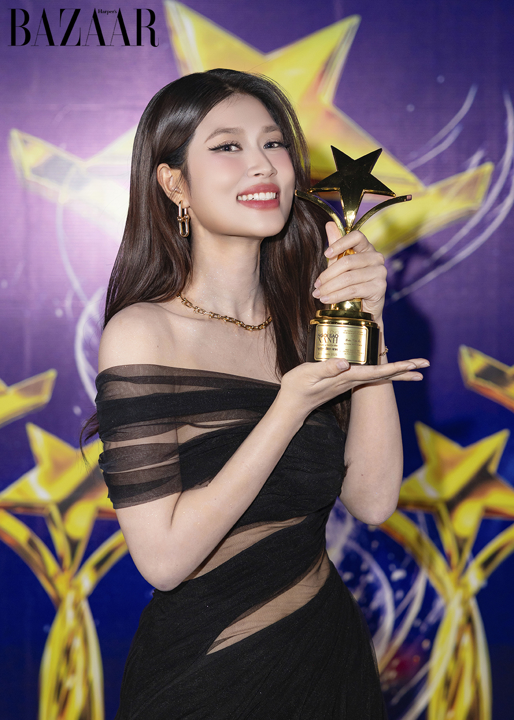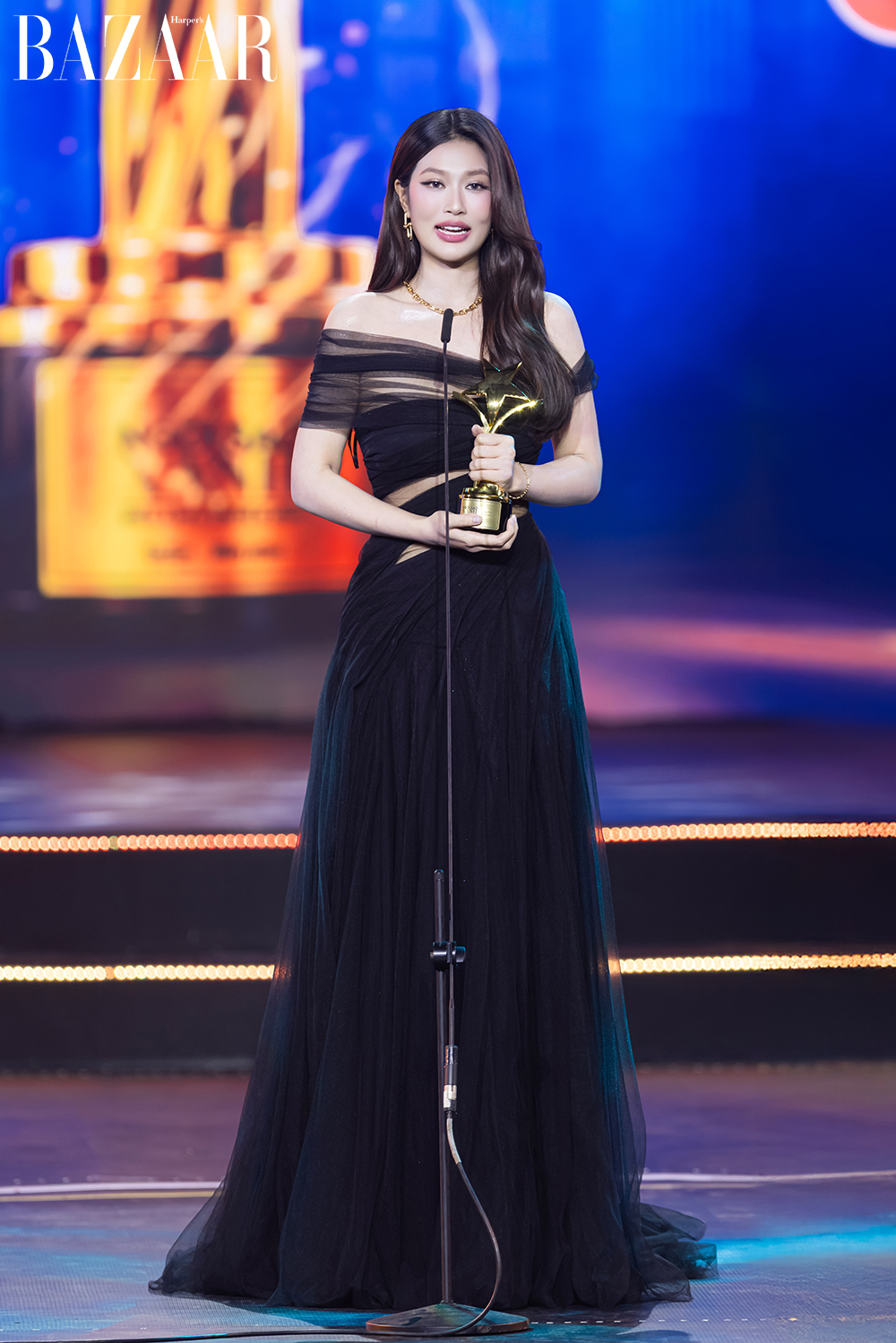 Tại Ngôi Sao Xanh 2025, Đoàn Thiên Ân thu hút mọi ánh nhìn khi xuất hiện trong trang phục dạ hội đen với những đường cut-out tinh tế khoe vóc dáng quyến rũ.