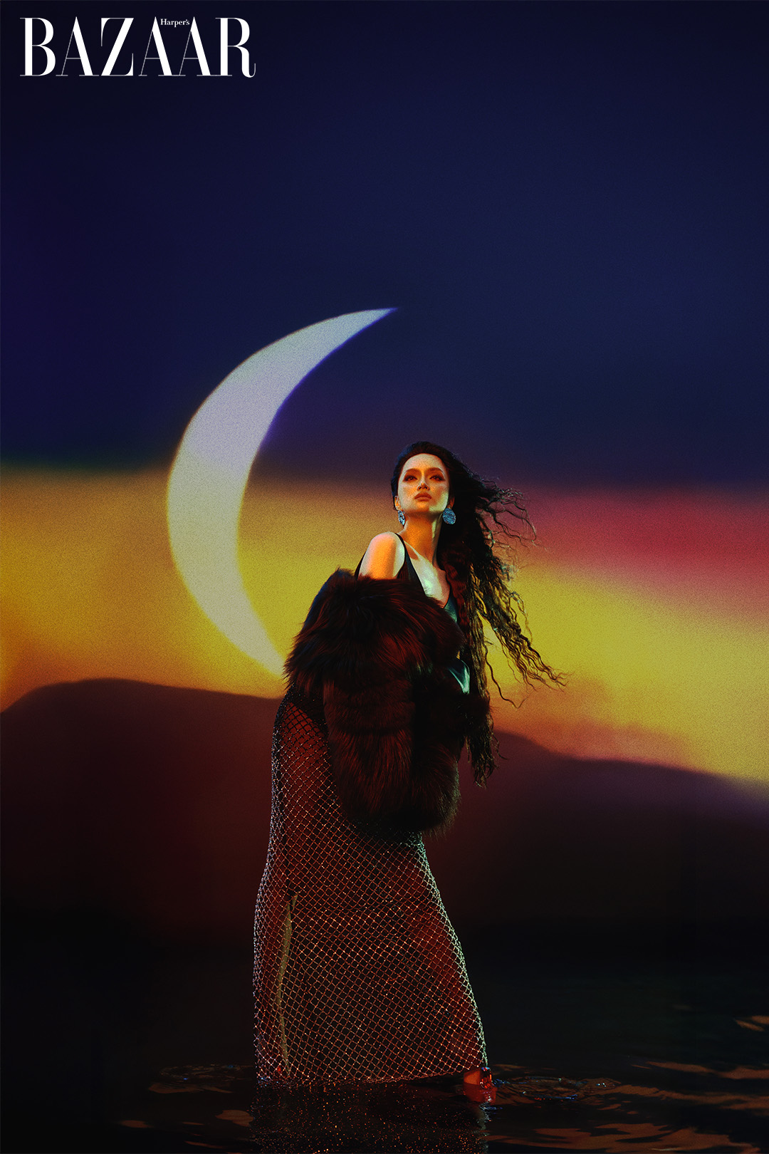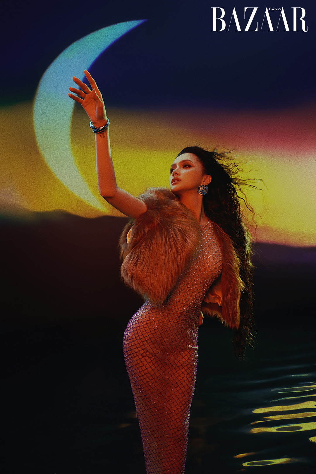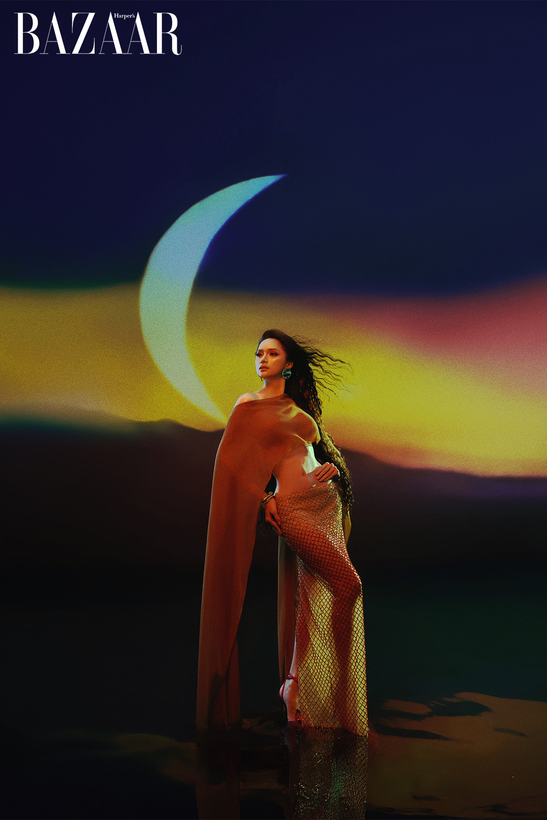 Trong từng khuôn hình, cô như đang kể lại hành trình của mặt trăng khi ẩn mình dịu dàng, khi bừng cháy rực rỡ; vừa mong manh, vừa toát lên nguồn năng lượng mạnh mẽ khó cưỡng.