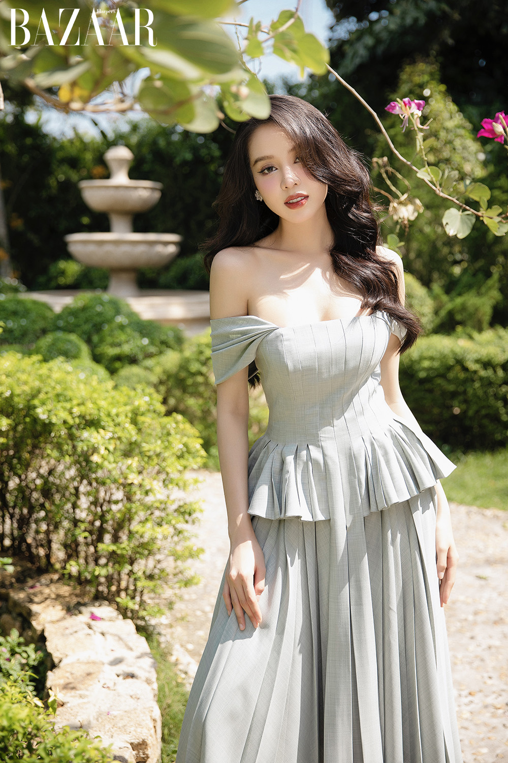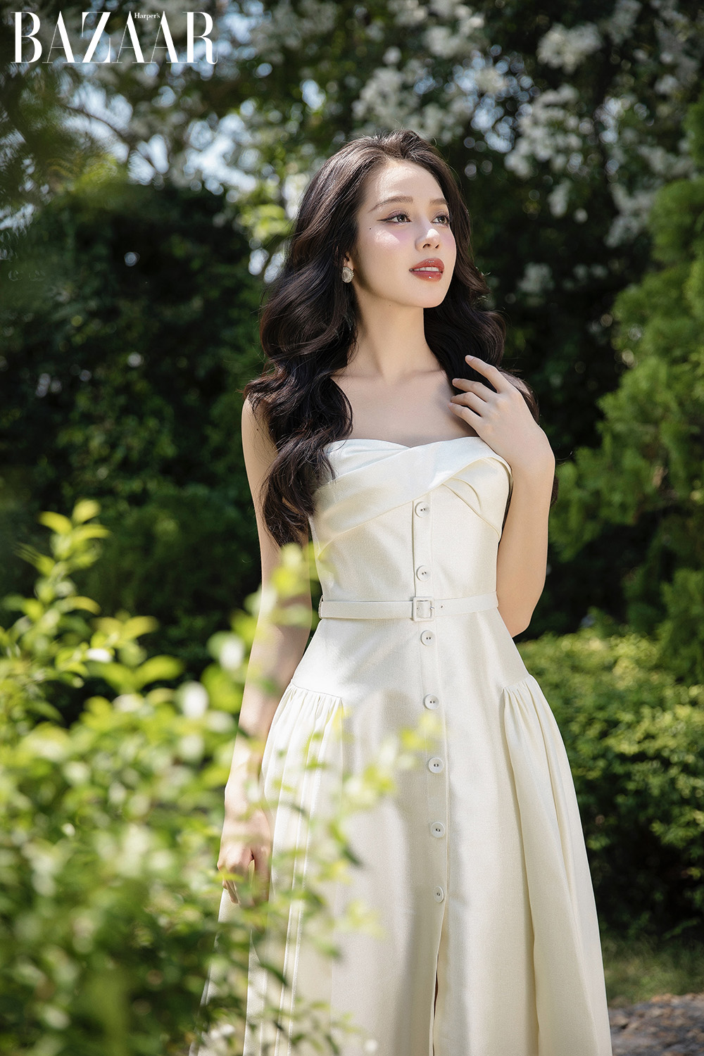 Kiểu dáng hai dây thời thượng cùng với phần chân váy xòe nhẹ nhàng, uyển chuyển trong từng bước chân người mặc. Phần eo được tạo độ phồng nhẹ cùng phần ngực sử dụng kỹ thuật draping mang đến tổng thể vừa lạ mắt, vừa cổ điển.