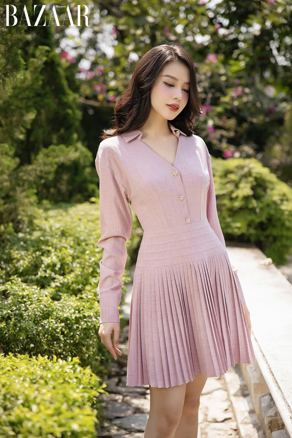 Một thiết kế xếp pli khác trong BST Xuân Hè. Chân vát xoè xếp pli kết hợp với thiết kế cổ V cách điệu giúp người mặc trở nên trẻ trung và duyên dáng.