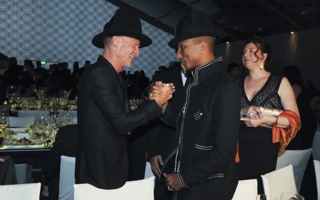 Nam ca sỹ Pharrell Williams (phải) mặc áo Chanel và mũ của Vivienne Westwood.