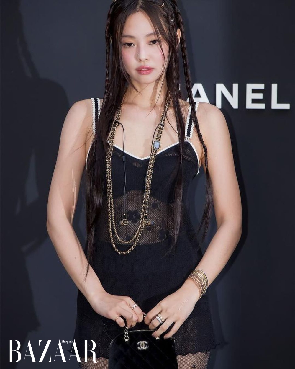 Chiếc váy dệt kim đen siêu ngắn, vớ monogram Chanel, dây chuyền dài mặt đồng hồ và khuyên mũi đã đủ để tạo nên một tổng thể nổi bật. Nhưng điểm nhấn khiến giới mộ điệu không thể rời mắt chính là những chiếc nhẫn Coco Crush được khéo léo luồn vào bím tóc.