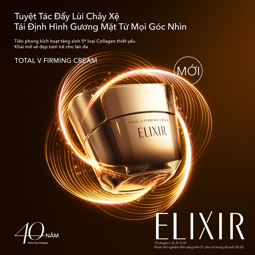 ELIXIR, từ khi ra mắt vào năm 1983, đã dành 40 năm để nghiên cứu khoa học Collagen. Nỗ lực không ngừng này đã tạo nên ELIXIR Total V-Firming Cream, sự kết hợp của những công nghệ hàng đầu, nhằm nâng cao hiệu quả chống chảy xệ và lão hóa cho làn da.