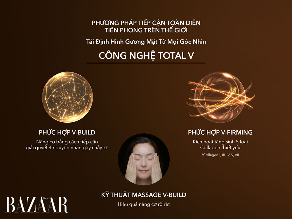 Công nghệ Total V độc quyền của ELIXIR định hình lại việc đẩy lùi các dấu hiệu chảy xệ của làn da bằng cách tập trung vào 4 yếu tố chính: