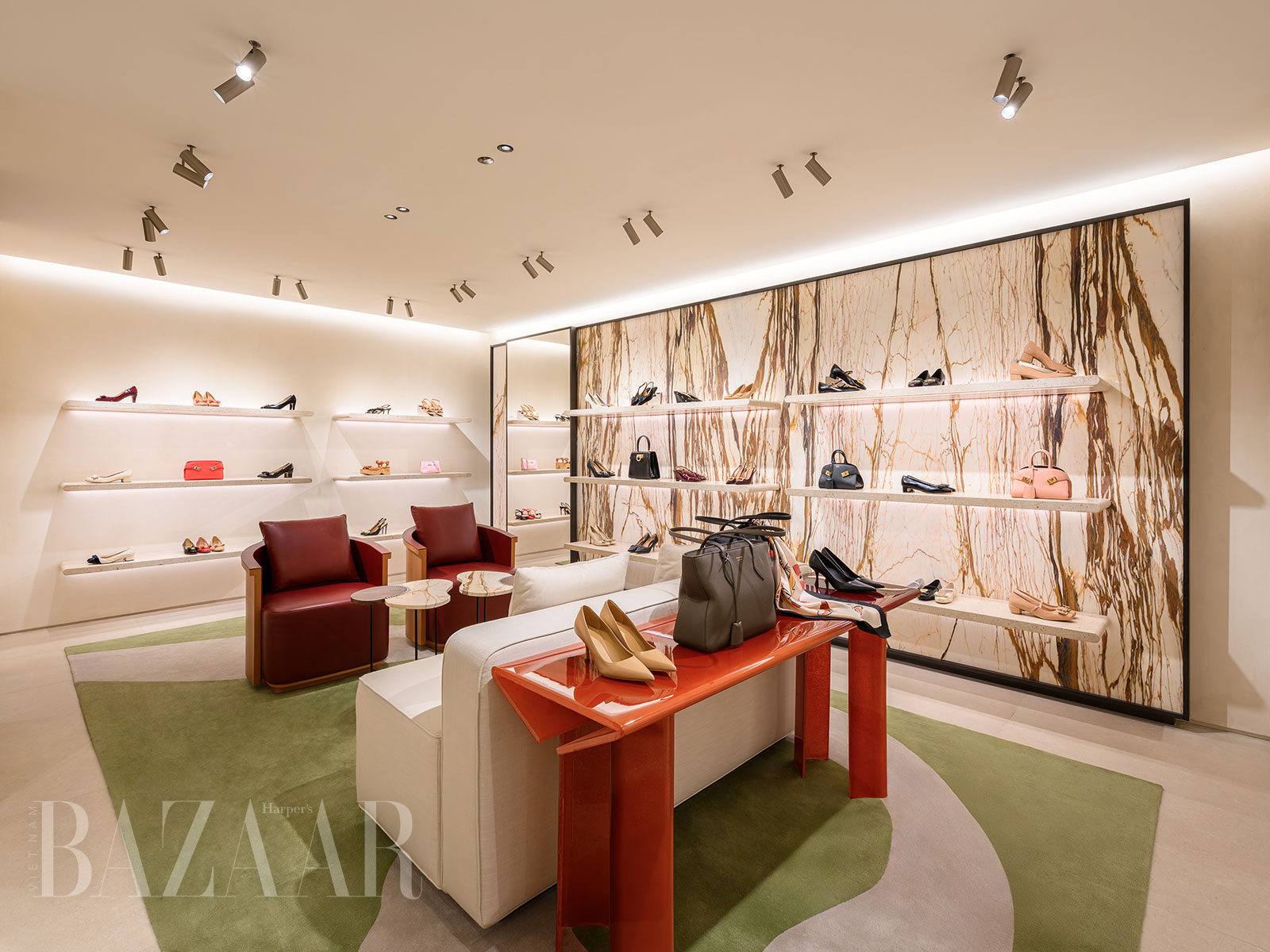 Mảng đá cẩm thạch Red Napoleon và Calacatta Copper tạo điểm nhấn cho cửa hàng Ferragamo ở Rex Arcade. Ảnh: DAFC Vietnam