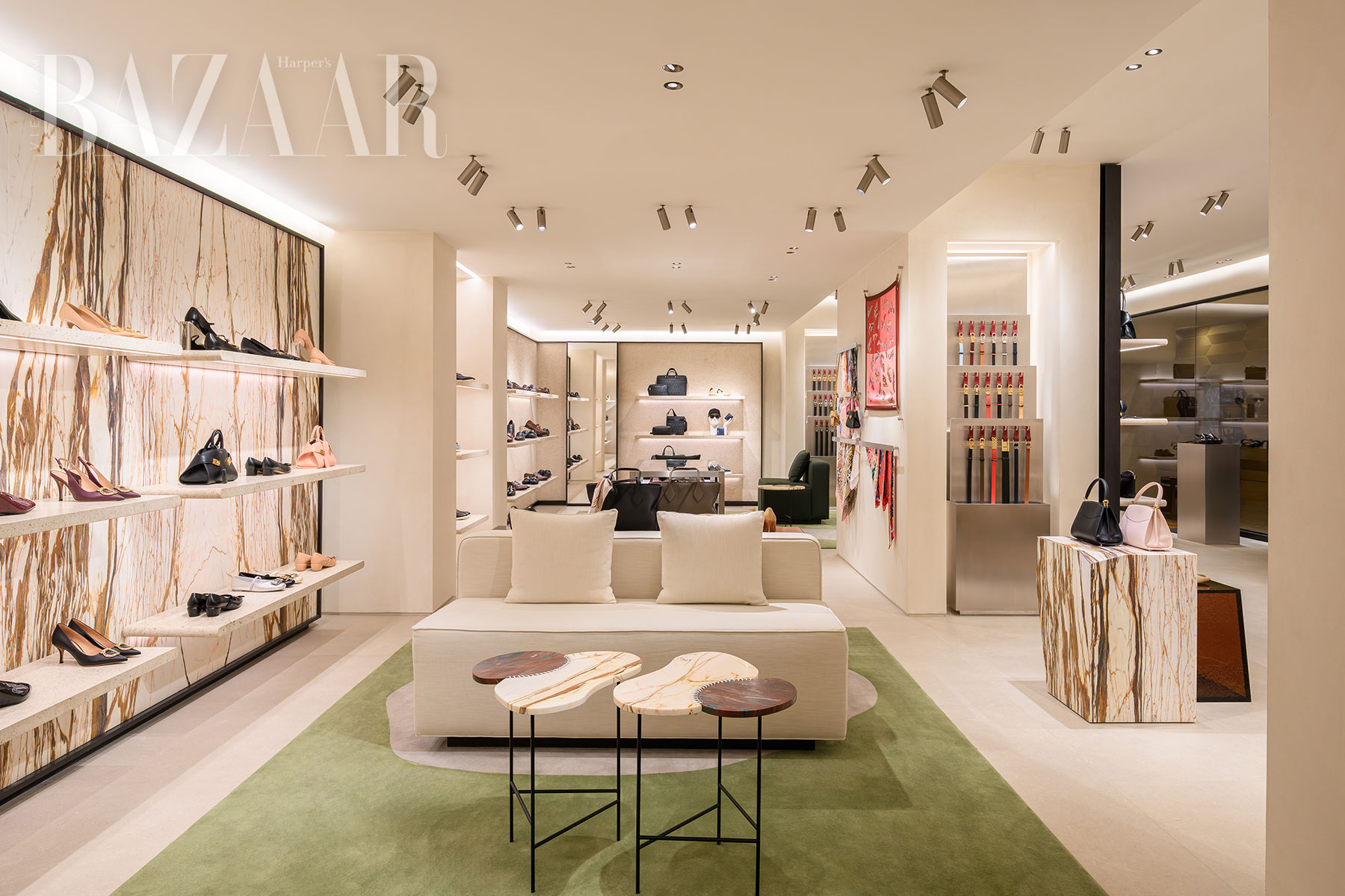 Rộng gần 130 mét vuông, boutique được thiết kế như một ngôi nhà Ý thanh lịch, nơi kiến trúc làm nền cho sản phẩm tỏa sáng. Mặt tiền đá Chambolle kết hợp họa tiết Bugnato mở ra tầm nhìn xuyên suốt vào không gian bên trong, trong khi các mảng đá cẩm thạch Red Napoleon và Calacatta Copper tạo điểm nhấn tinh tế, mang lại cảm giác ấm áp nhưng không kém phần hiện đại. Những chi tiết nội thất mang tính– từ hệ kệ đá đến các bàn Corallium khâu da – khéo léo gợi nhắc di sản, đồng thời đặt trong bối cảnh thẩm mỹ rất “đương thời”.