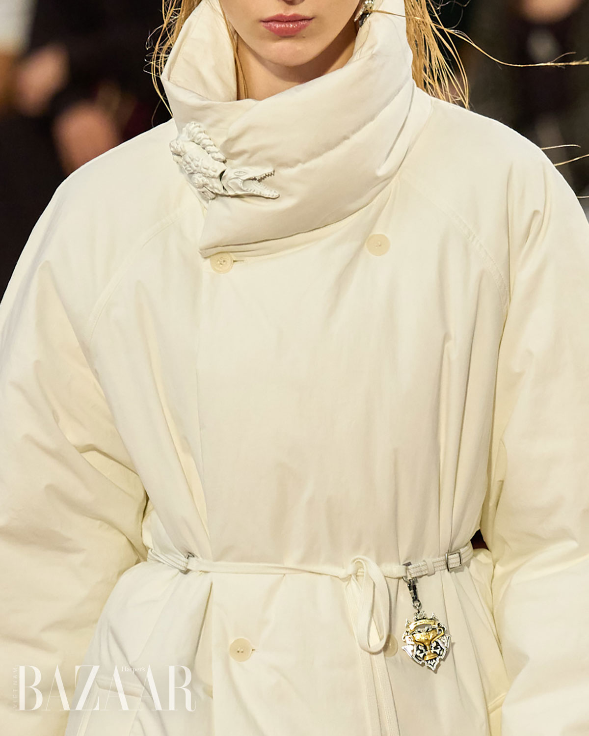 Xuất hiện xuyên suốt bộ sưu tập Lacoste Thu Đông 2025 là những thiết kế unisex có thể mặc xuống phố, đi học hay đi làm. Trang phục mang hình khối táo bạo nhưng vẫn nhẹ nhàng: Áo khoác phao bồng bềnh được cắt may bằng chất liệu bóng bẩy, quần ống rộng bằng satin mượt, áo polo kéo dài thành những chiếc váy bồng bềnh.