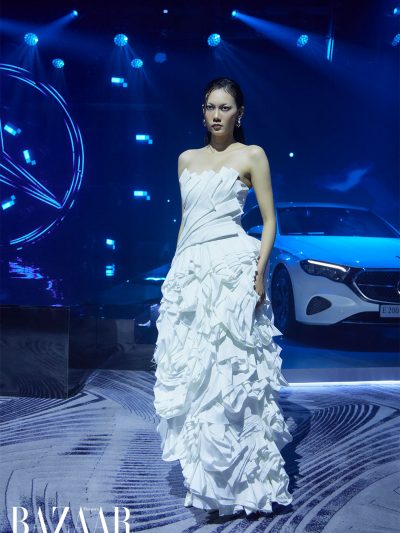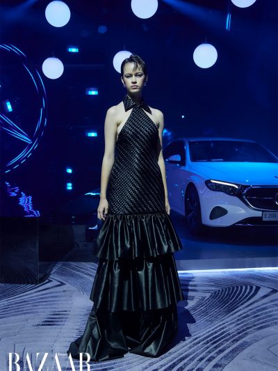 Trong khi đó, thiết kế thứ hai chọn organza, chất liệu mỏng nhẹ nhưng đầy sức sống, để làm chủ đạo. Những lớp organza chuyển động dưới ánh sáng như ẩn dụ cho sức mạnh, sự kiên định và tinh thần bền vững, giá trị cốt lõi của dòng xe E-Class, biểu tượng của sự sang trọng vượt thời gian.
