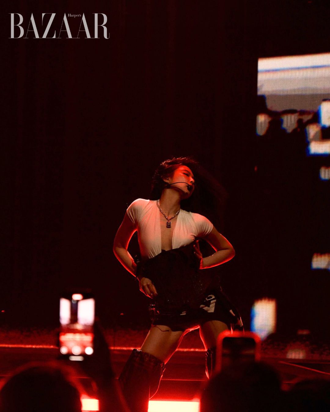 Cụ thể là bản phối trình diễn bài hát Like Jennie trong đêm diễn The Ruby Experience tại Los Angeles hồi ngày 10/03, Jennie đã mang đến lối biến tấu khăn choàng thành chân váy mini tương tự. Việc quấn khăn thành váy không mới, nhưng Jennie cố tình thả một tà dài chấm đất với khăn choàng dài từ Doublet để có phần vải bay bổng theo từng cú lắc hông.