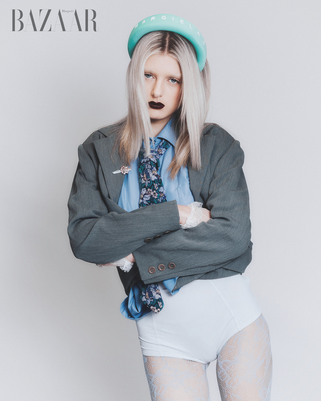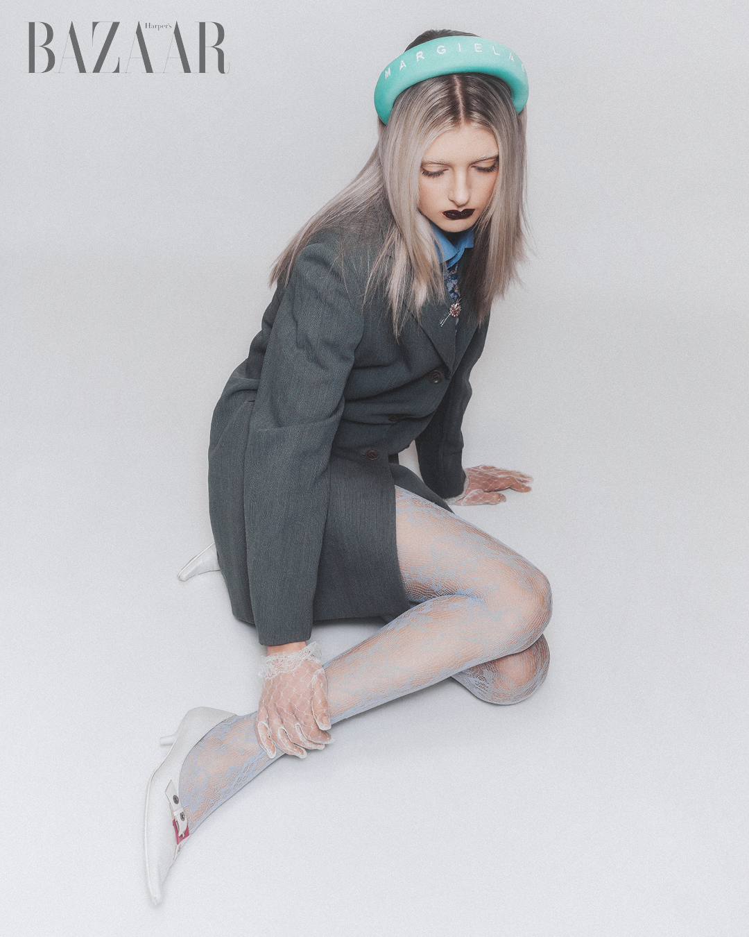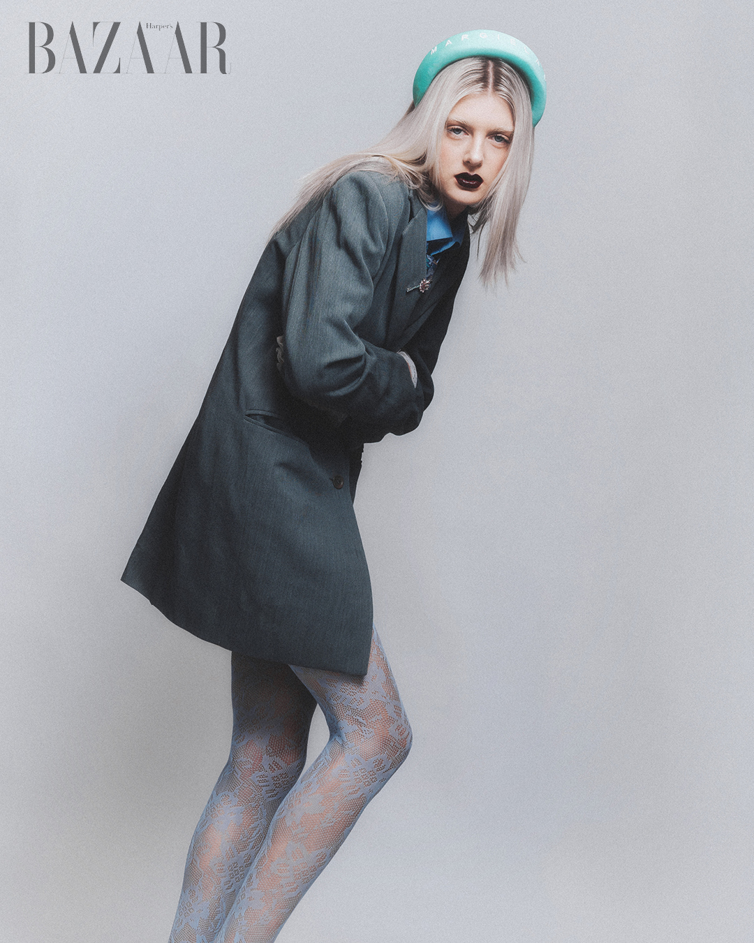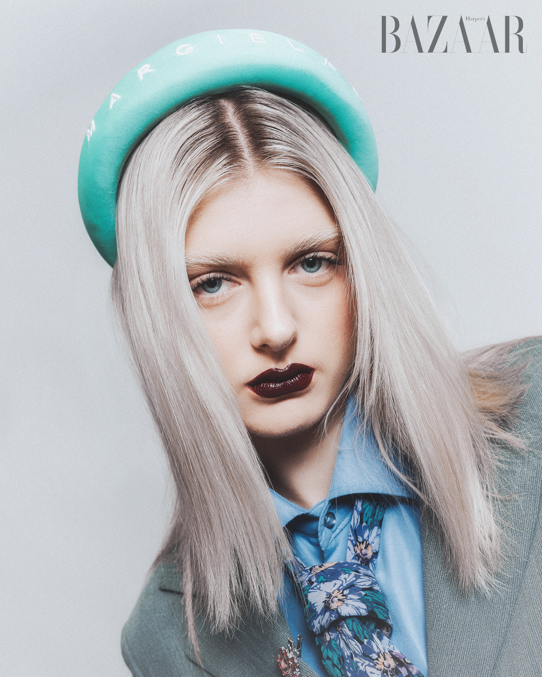 Băng đô tóc: Maison Margiela. Cài áo: Zara Child. Áo jacket: sản phẩm may đo của Ý.